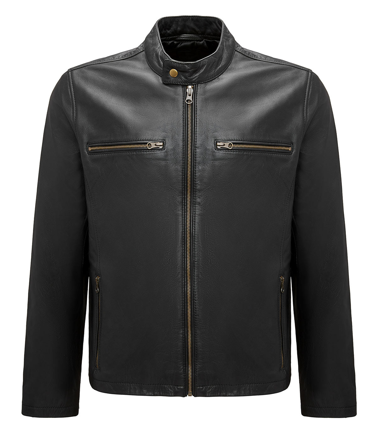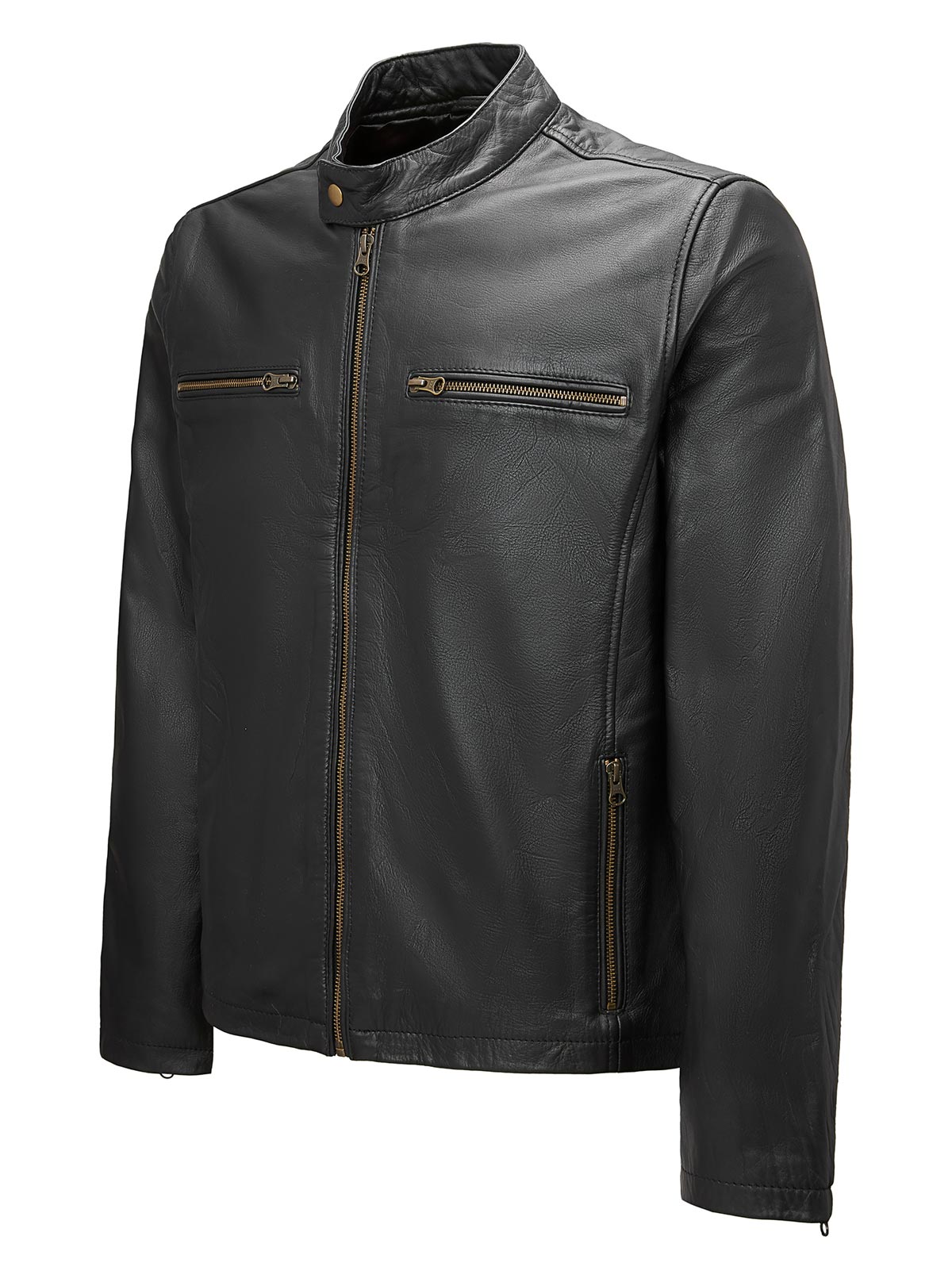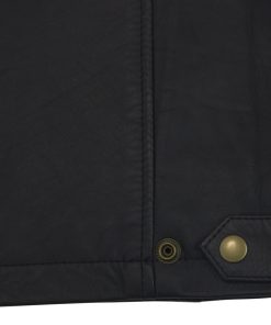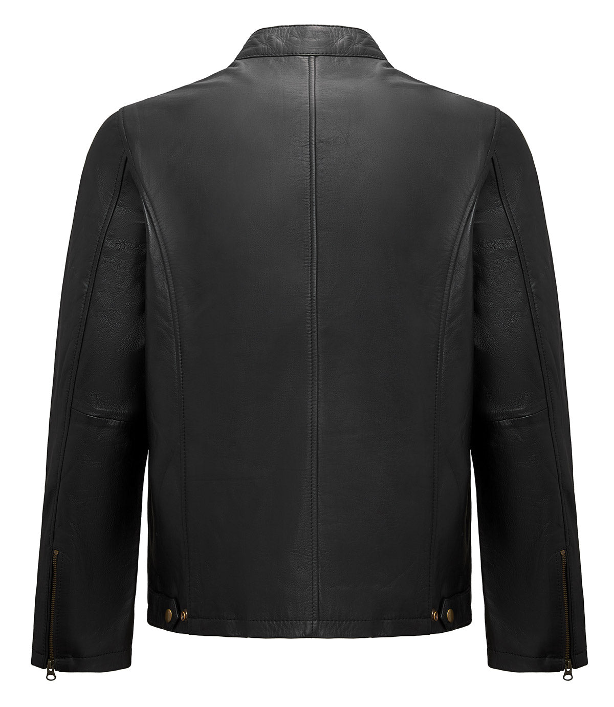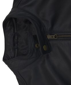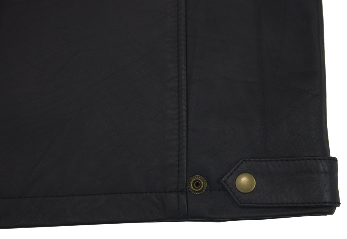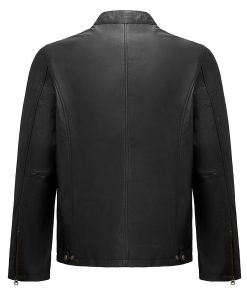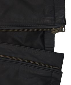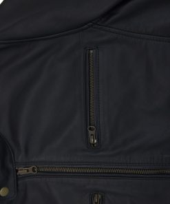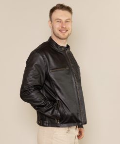 This stylish black leather jacket combines modern design with practical features. It has two hip pockets and two additional pockets at the top, providing you with plenty of storage space. The zipper in the middle can be opened from both the top and bottom, providing additional flexibility. The collar is equipped with a snap button closure for a secure fit.