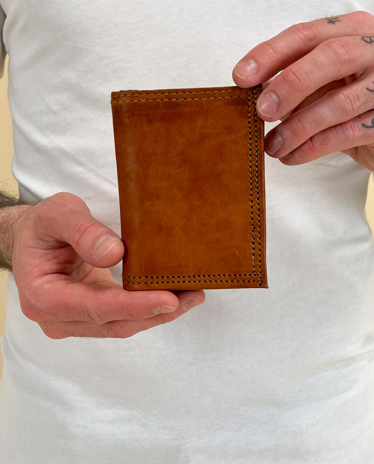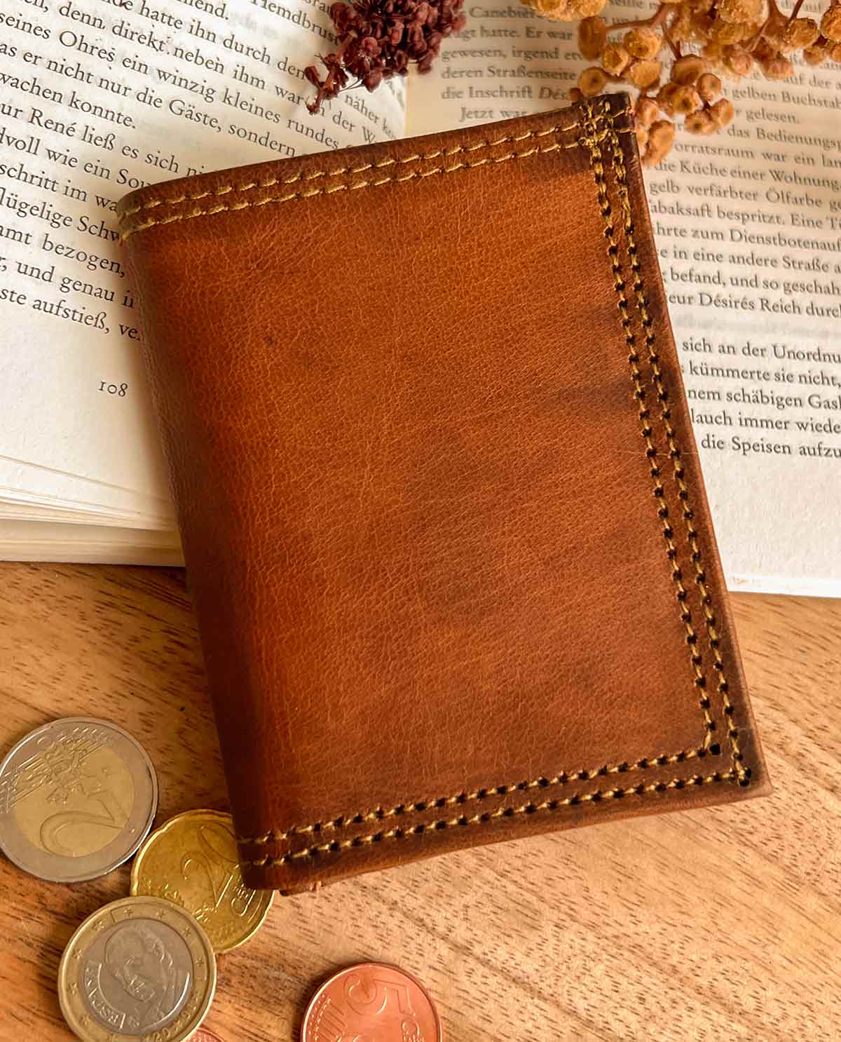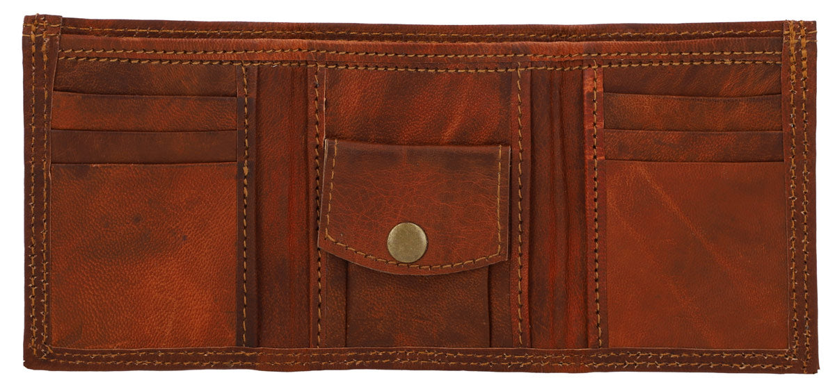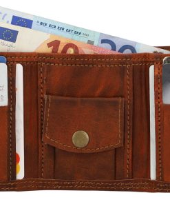 Our wallet “Arjen” has three sections that hold up to six cards, cash, and change. There’s a coin pocket in the middle, secured with a press button, for your change, as well as card slots on either side for your credit cards, loyalty cards, and more. At the back of the wallet, you’ll find an additional pocket for your cash and receipts. Keep your cash, cards, and coins safe by folding up this wallet. “Arjen” is made from sturdy goatskin leather that just gets better with age. You’ll be able to enjoy his natural charm for years to come.