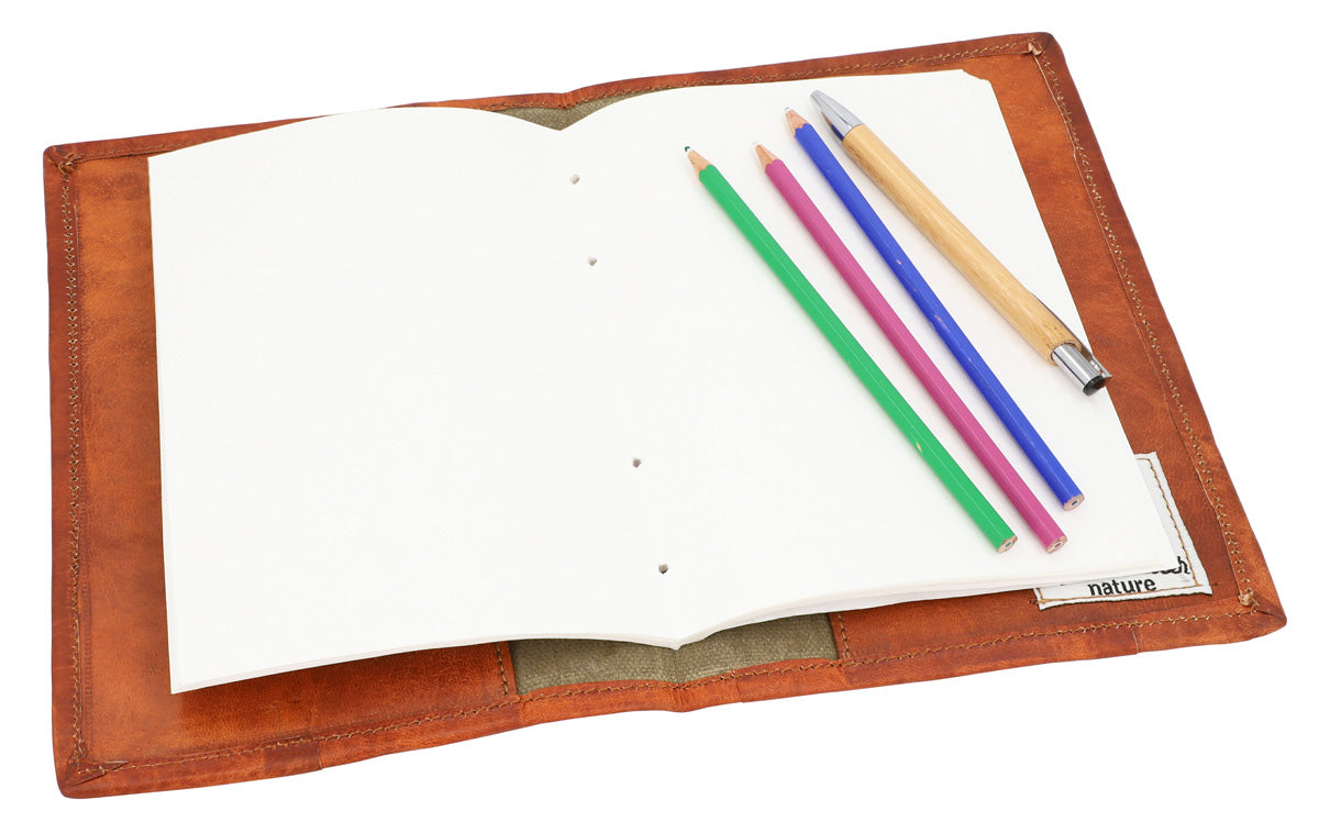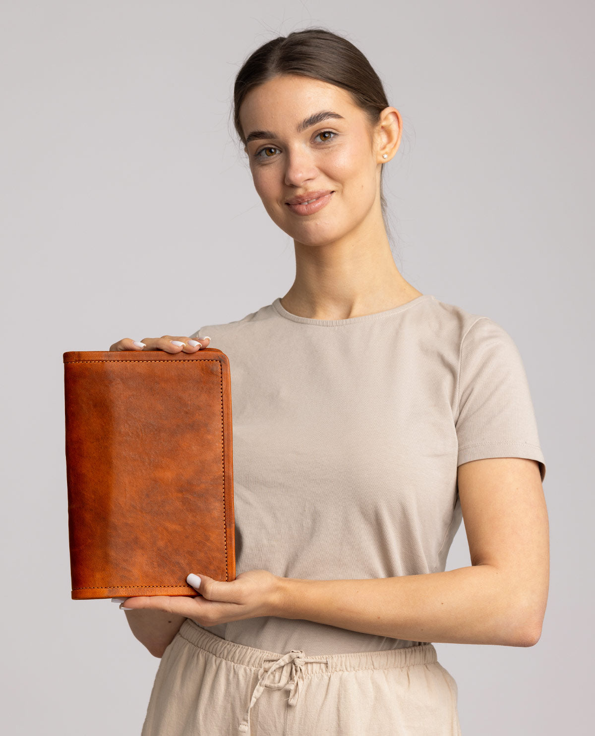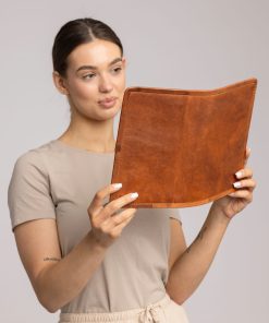 The soft, naturally-tanned, light-brown goatskin leather fits snugly around your book. This book cover combines a natural look with a trendy vintage design, charming you with its simple and sleek look. The look and touch of this book are simply charming. Take your favourite book with you wherever you go, without having to worry about prying eyes. It can also be used as a protective cover for your notebook. A true shapeshifter, our “Becky”.