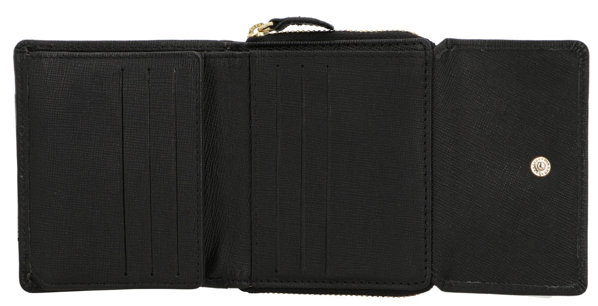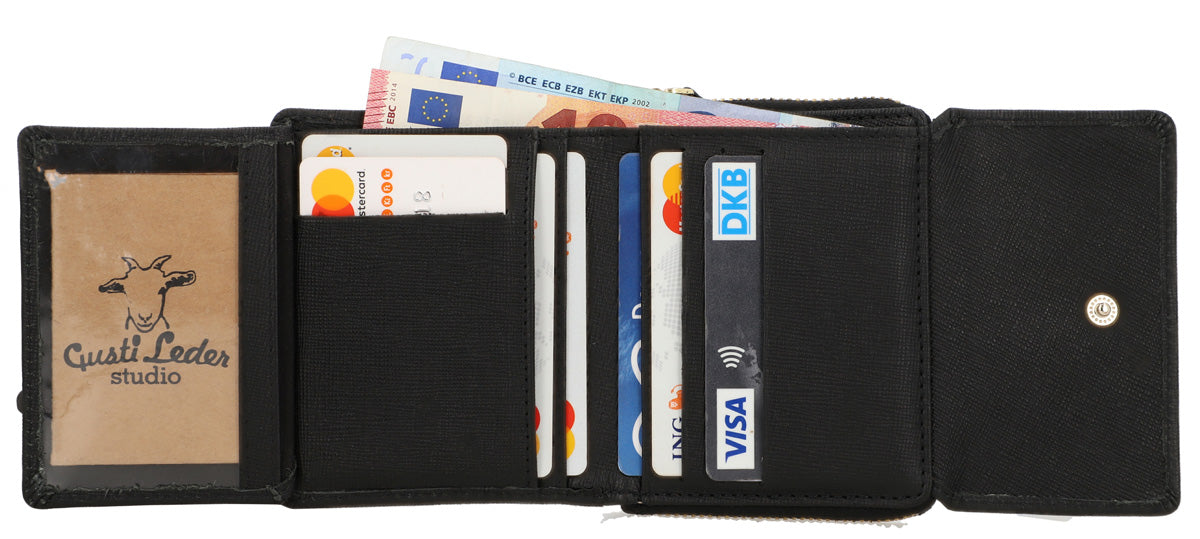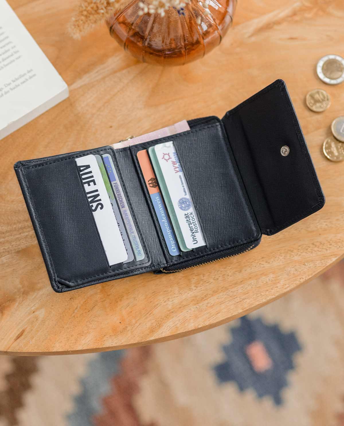 “Brigitta” has a note compartment, folding viewing window, 6 card slots and a coin pocket, secured by a press button, inside. Keep your spare change safe in your pocket. This high-quality processed Saffiano cowhide leather purse is secured by a press button. Pop her in your pocket and hit the road with “Brigitta”.