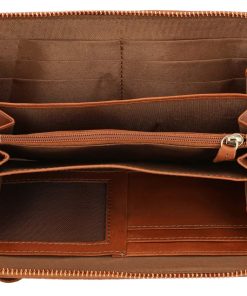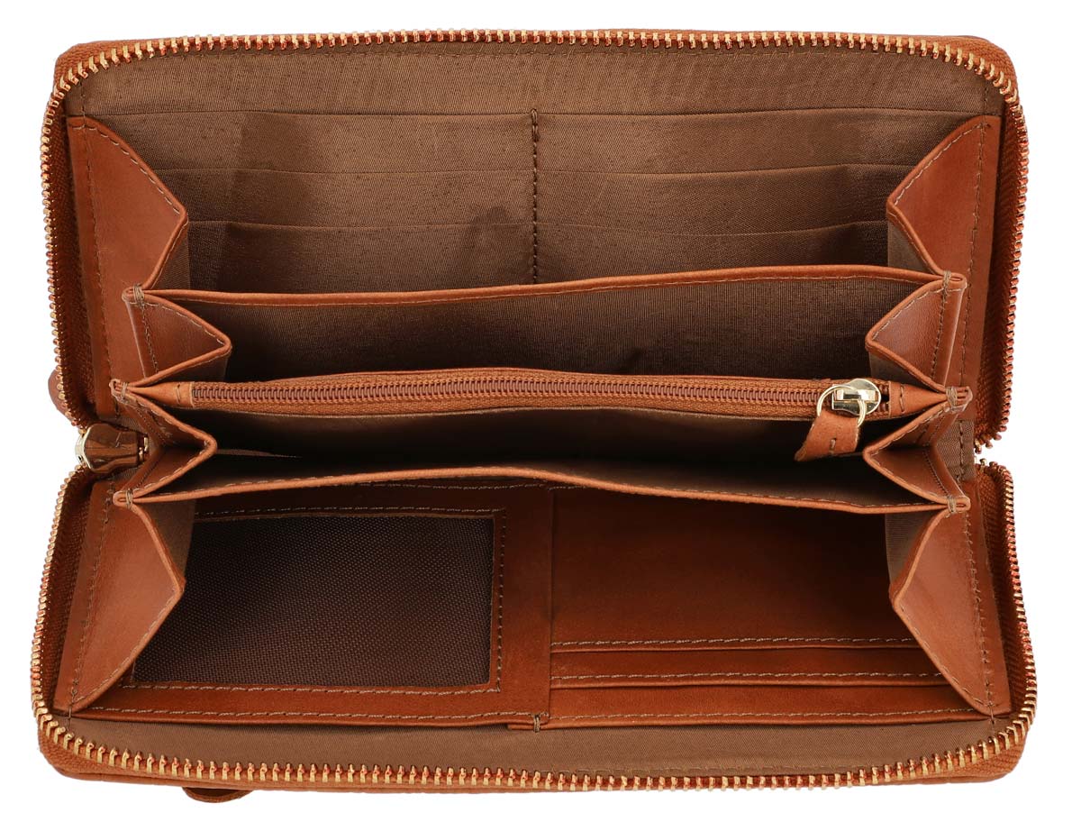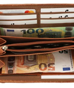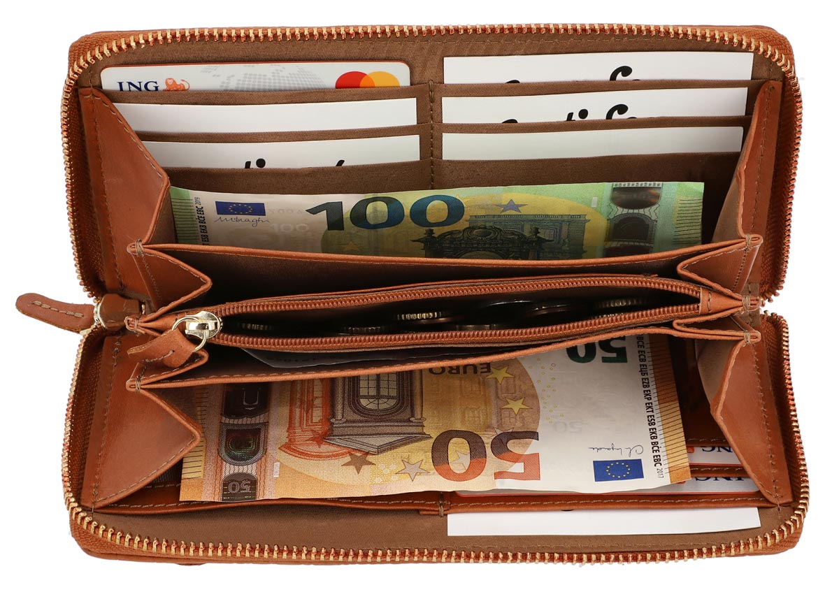 Inside, „Cara“ features 5 interior compartments – so you have space for all your small and large bills and coins. The two exterior compartments offer space for 10 cards. Additionally, you have a coin compartment in the middle which you can close with a zipper. Next to the coin compartment on both sides, you finally have space for your bills. A large golden zipper perfectly protects your belongings so nothing can fall out. “Cara” – a complete package when it comes to wallets!