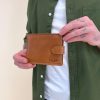 Our wallet “Foster” has a classic look. Made of robust buffalo leather, “Foster” is a lifelong companion. Quickly opened, you find at least six compartments for your cards. Your ID can be placed in a transparent pocket. A separate compartment holds your banknotes, and naturally, there is also a coin pocket, securely closed with a snap button.