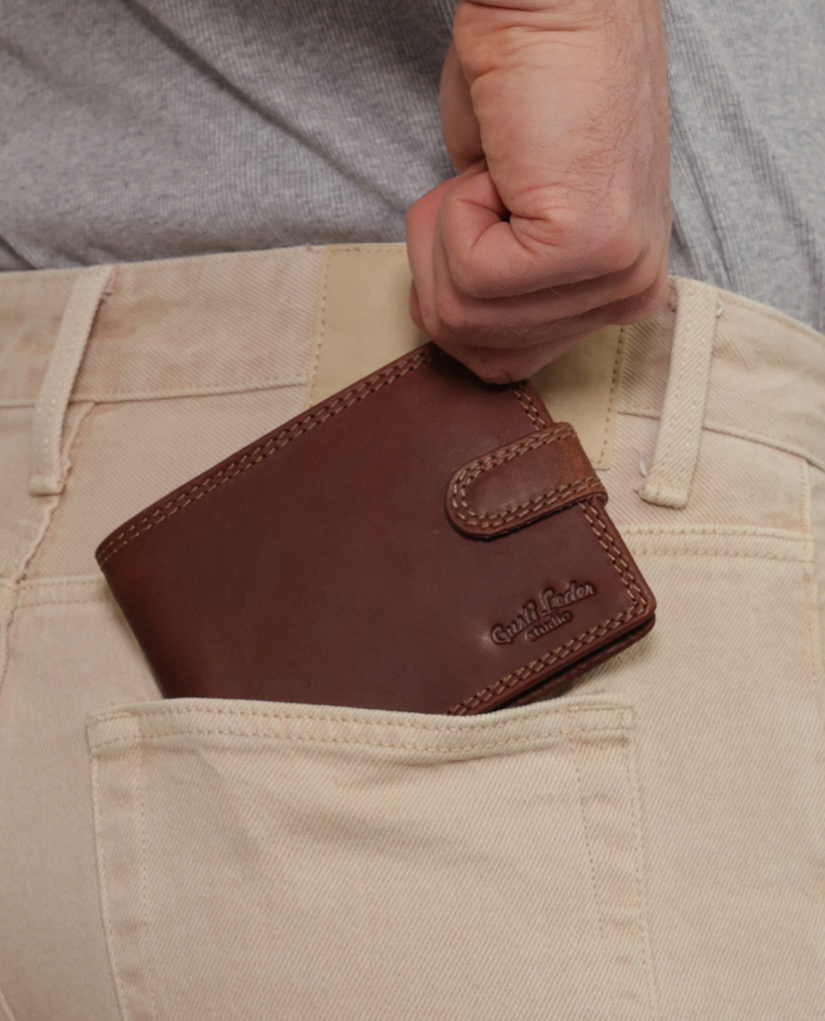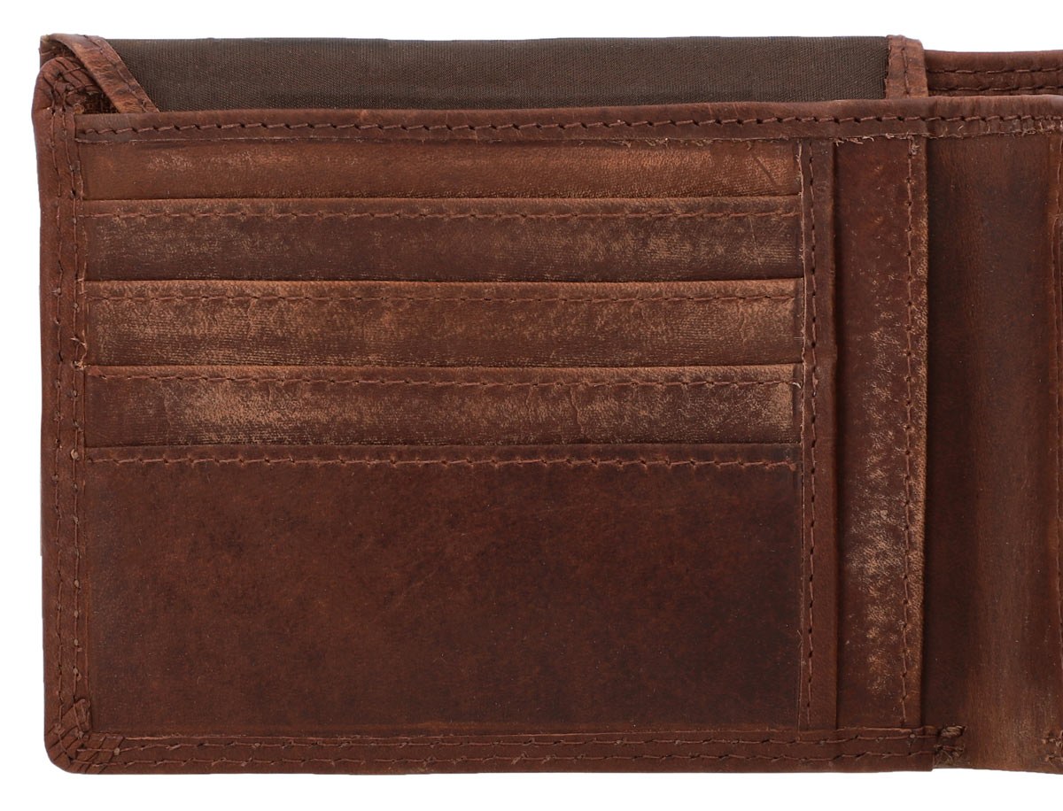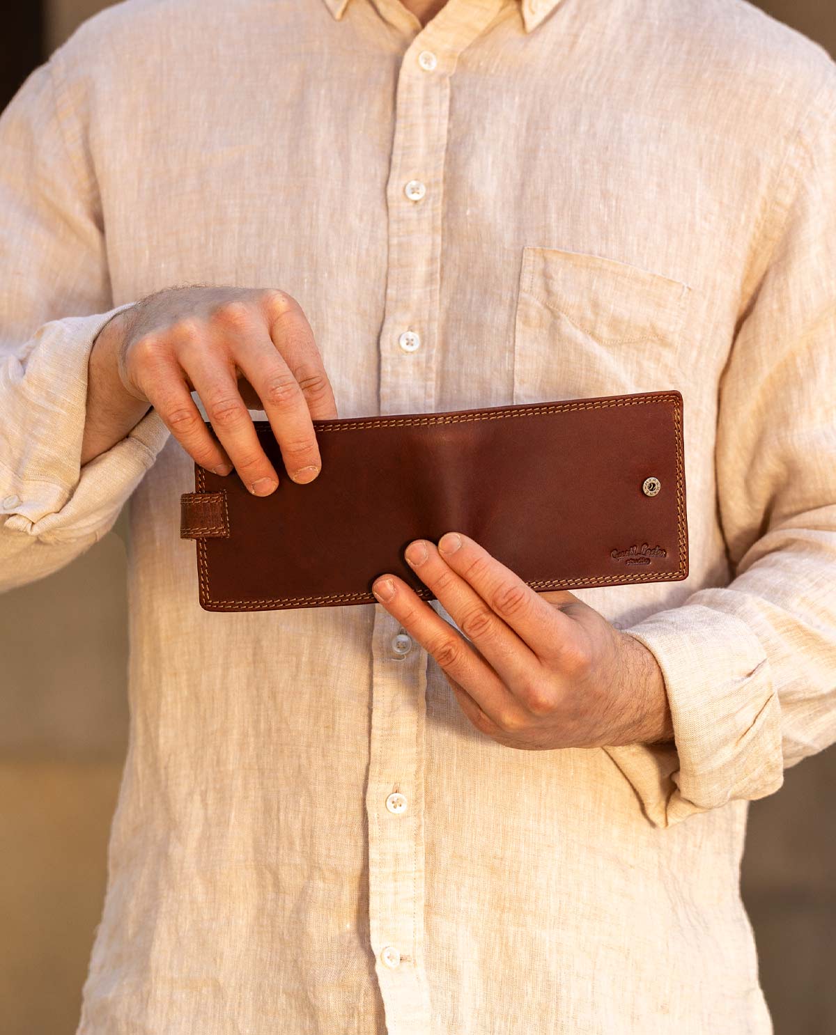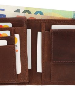 Inside, you have maximum comfort in functionality. The clever organization system helps you to quickly and easily have your most important cards, IDs, coins, and bills at hand. Where at first glance there doesn’t seem to be much space, there’s more than you think. Folding techniques and compartments allow you to store everything you can imagine. A viewing window with dimensions of 10.5 x 6.5 cm allows you, for example, to show your monthly ticket without having to take it out. The cowhide is of high quality and extremely durable. It offers you and your wallet great shape stability and promises that you will enjoy this great product for a long time. A snap fastener connected with a tab closes the wallet easily and conveniently.