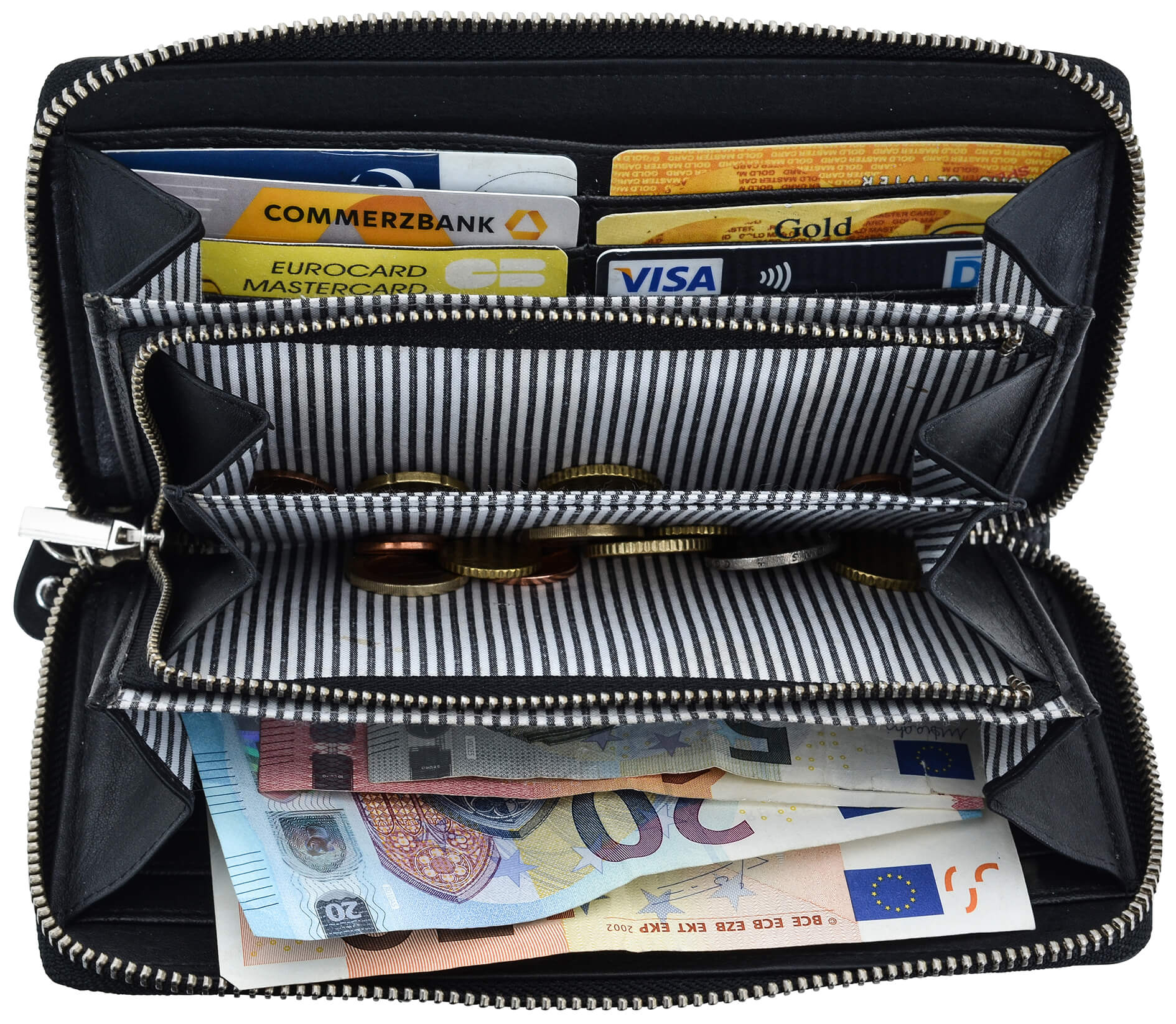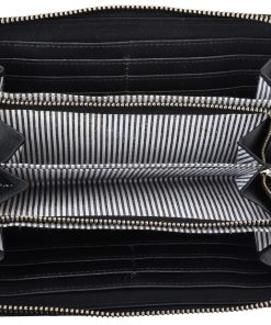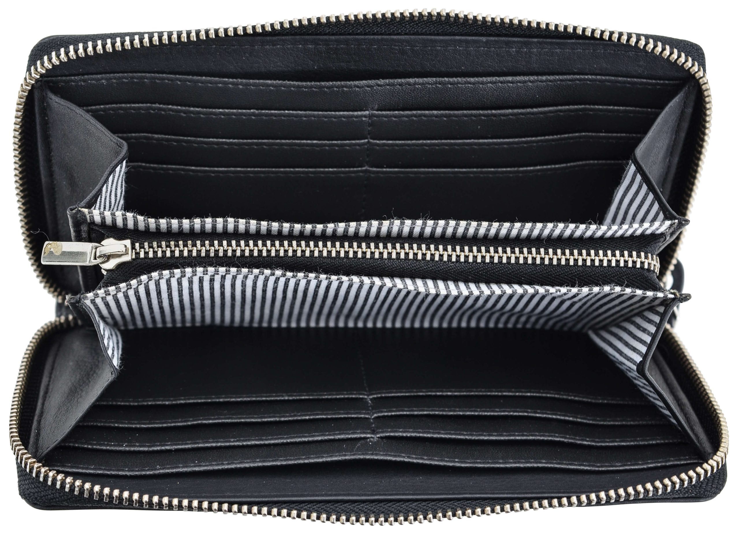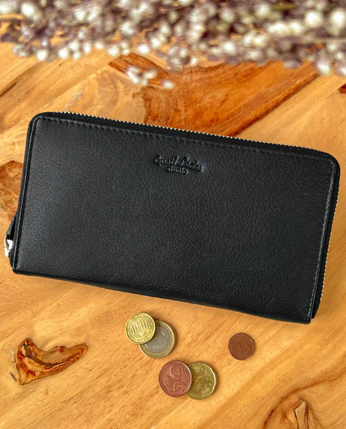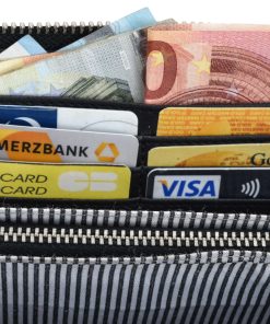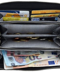 Our purse “Iris” is super spacious. She has plenty of space for your tickets, cards, as well as 2 zipped pockets for your spare change. So, you can keep your change under control. There are multiple card slots for your credit cards and bank cards. This striking cowhide leather purse exudes a natural elegant charm. The secure zip ensures your belongings won’t get lost when you’re on the go. “Iris” is lined with a playful striped fabric. If you’re a bit of a maximalist and need a place to keep your belongings safe, then “Iris” is exactly what you need.