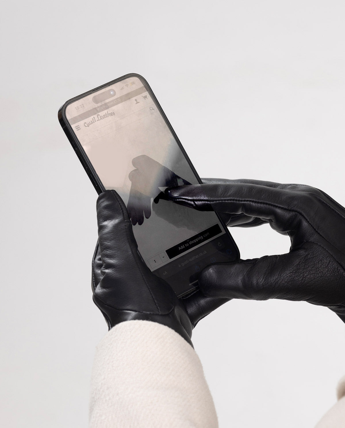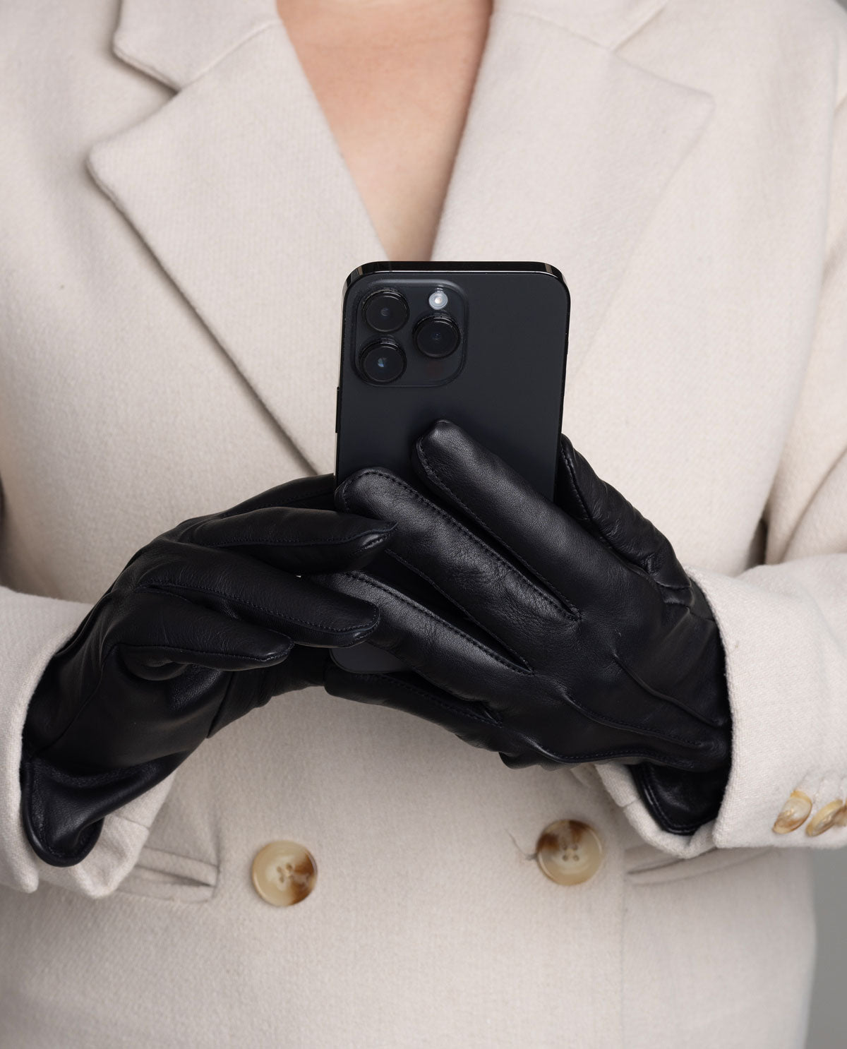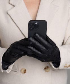 Our leather gloves “Iver” come in a classic black leather and are the perfect accessory for fashion-conscious women. These high-quality leather gloves are comfortable and elegant, the soft leather fits your hands perfectly, providing a pleasant, smooth feel.