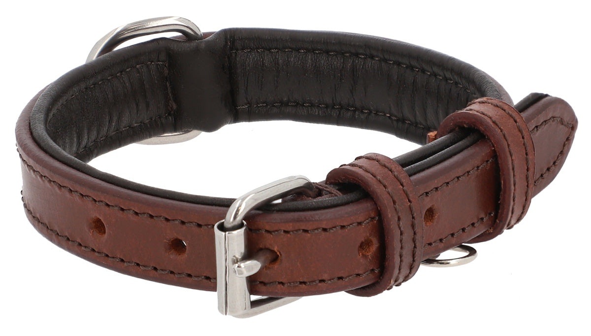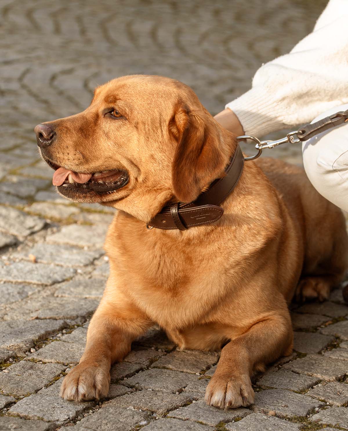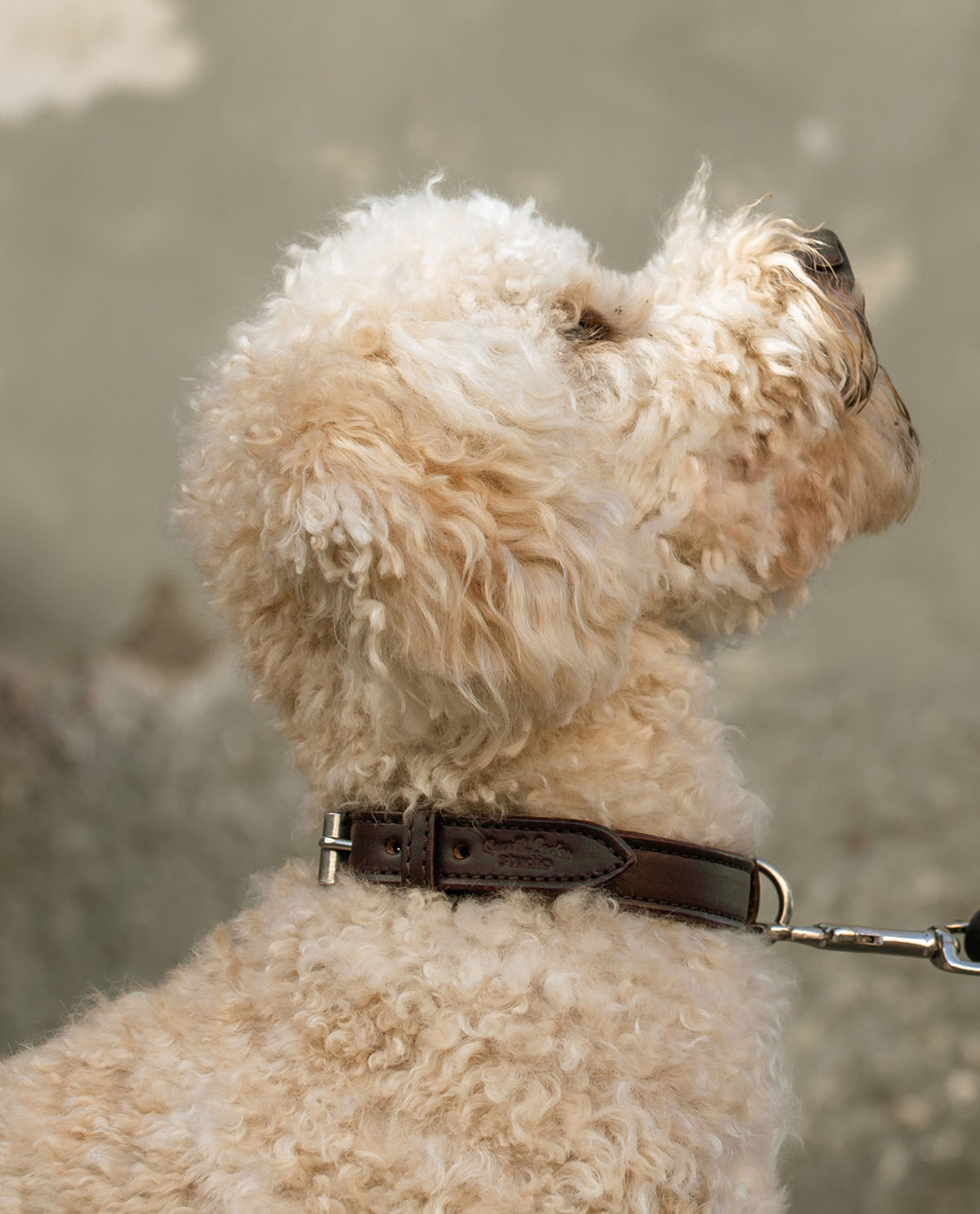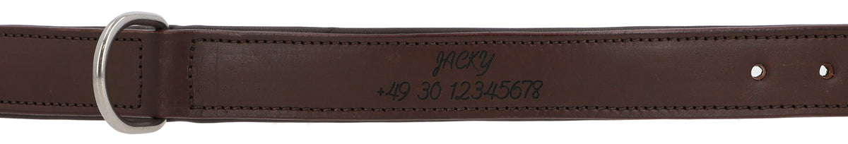 Discover our stylish high-quality brown leather dog collar “Jacky”. It’s the perfect accessory for your four-legged companion! Its elegant gold buckles make a fashion statement and offer lasting quality and secure fit. The soft leather rests comfortably around your dog’s neck, providing maximum comfort. Available in sizes S to XL, “Jacky” suits dogs of all sizes. Use it on your daily walks or special occasions, this dog collar combines style and function for both dog and owner. Ready for your next adventure together?