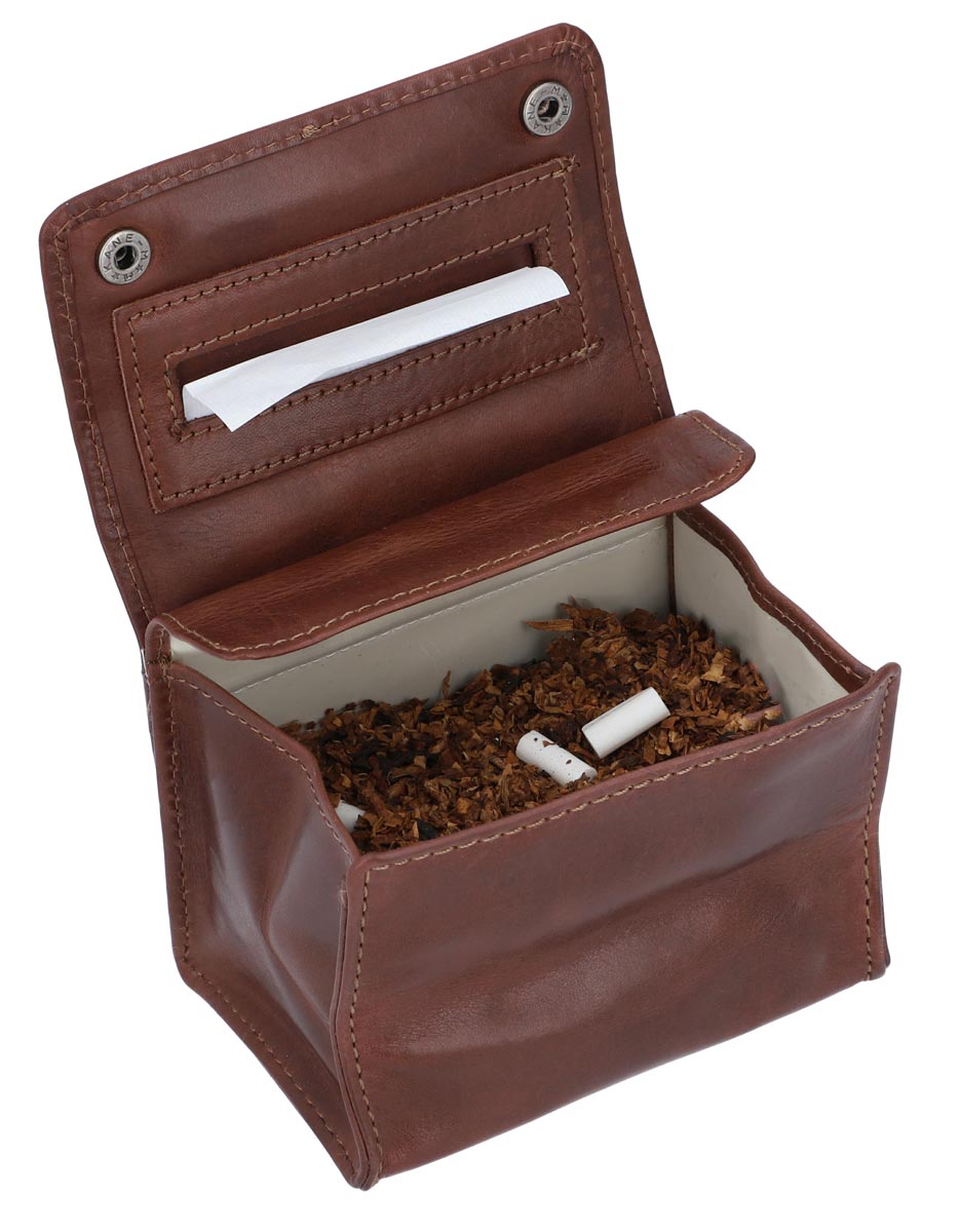 “Lutz” helps you keep your tobacco safe and secure. The large inner compartment is lined with natural rubber and is the perfect place to keep your tobacco fresh. You’ll find an extra pocket on the back for your filters and you can store your rolling papers in the small pocket on the folding lid. No more rummaging around! Your filters are kept safe by a sturdy zip. Use the press button to secure your tobacco when you’re on the go. “Lutz” comes in three different colours, so there’s something for every taste. The robust cowhide leather gives this tobacco pouch a cool vintage look. Spice up your cigarettes with “Lutz”.