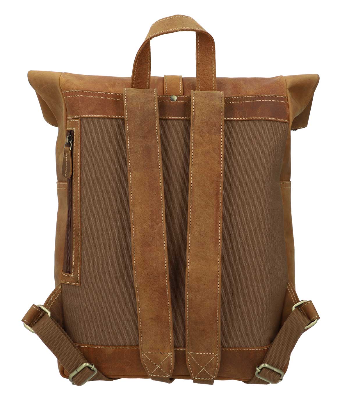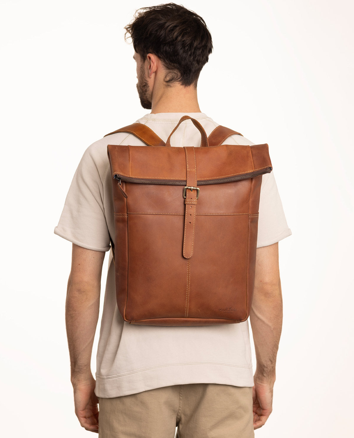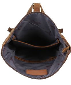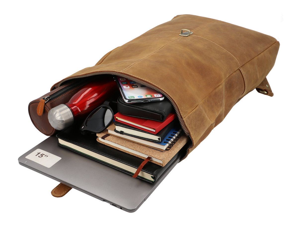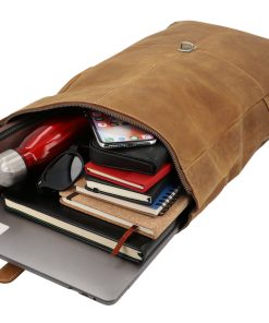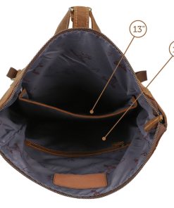 “Henning” is a medium-sized roll top backpack made of sturdy, camel brown goatskin leather that’ll help you navigate the big city maze or narrow metro lines with ease thanks to its slim cut. Its well-thought-out layout has more than enough space in the large main compartment for your A4 folders, 15” notebook, books and a large water bottle, there’s an additional zip pocket inside so that you can organise your things and find them with ease. The bright inner fabric is made of water-resistant polycotton which protects your backpack from moisture and marks, so you don’t need to worry if you have any small mishaps. The zipped pocket on the side has plenty of space for all of your belongings and the padded back section and the inner side of the wide shoulder straps are covered in brown canvas to offer you extra comfort.