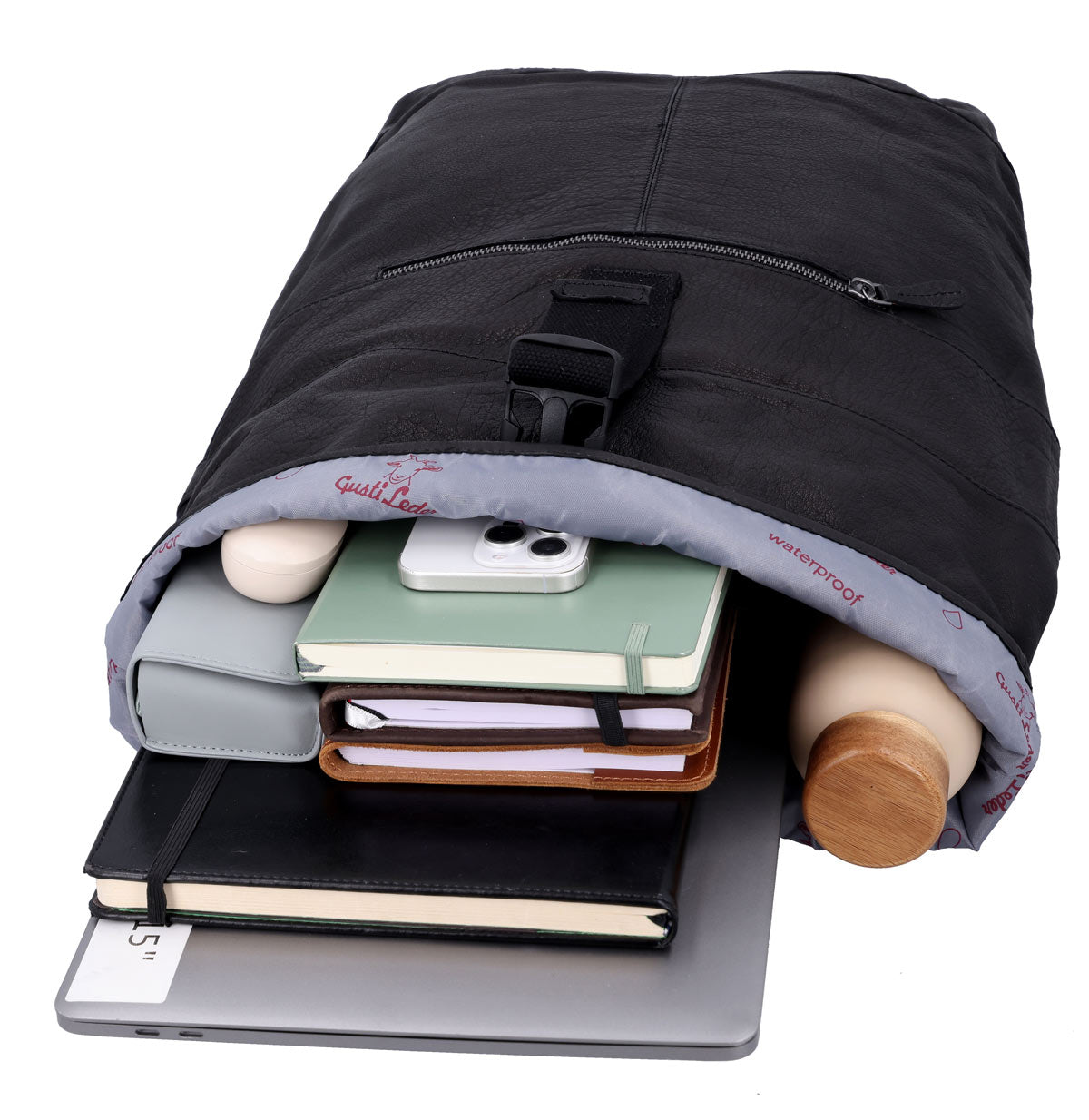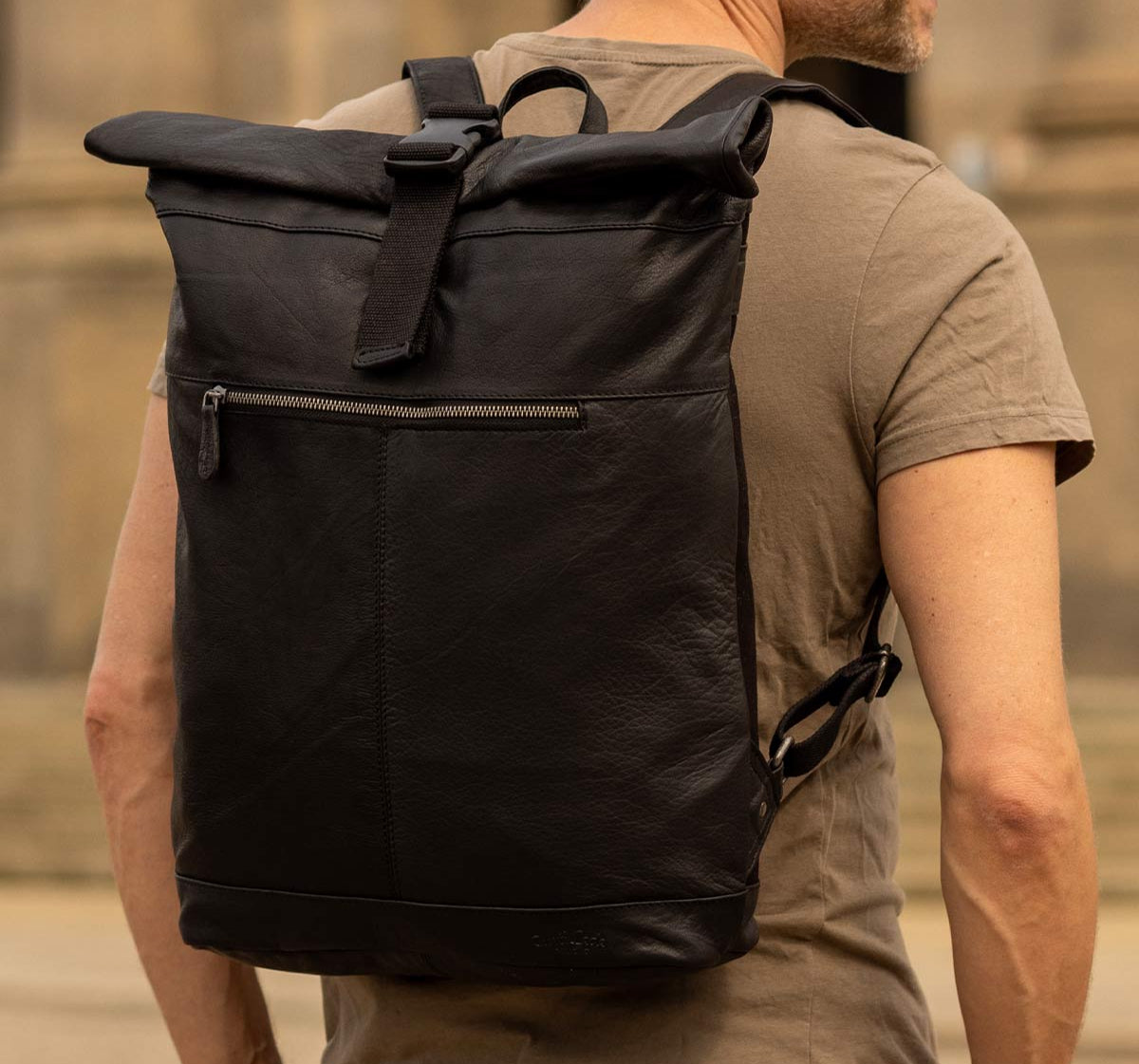 Our “Mattis” roll top backpack is the perfect companion, no matter if you’re going to school, uni, or work. He’ll win you over with his flexibility, comfort, and space. This sturdy, classic daypack made of black buffalo leather stands out from the crowd with its trendy roll top—a look that you just can’t ignore at the moment.