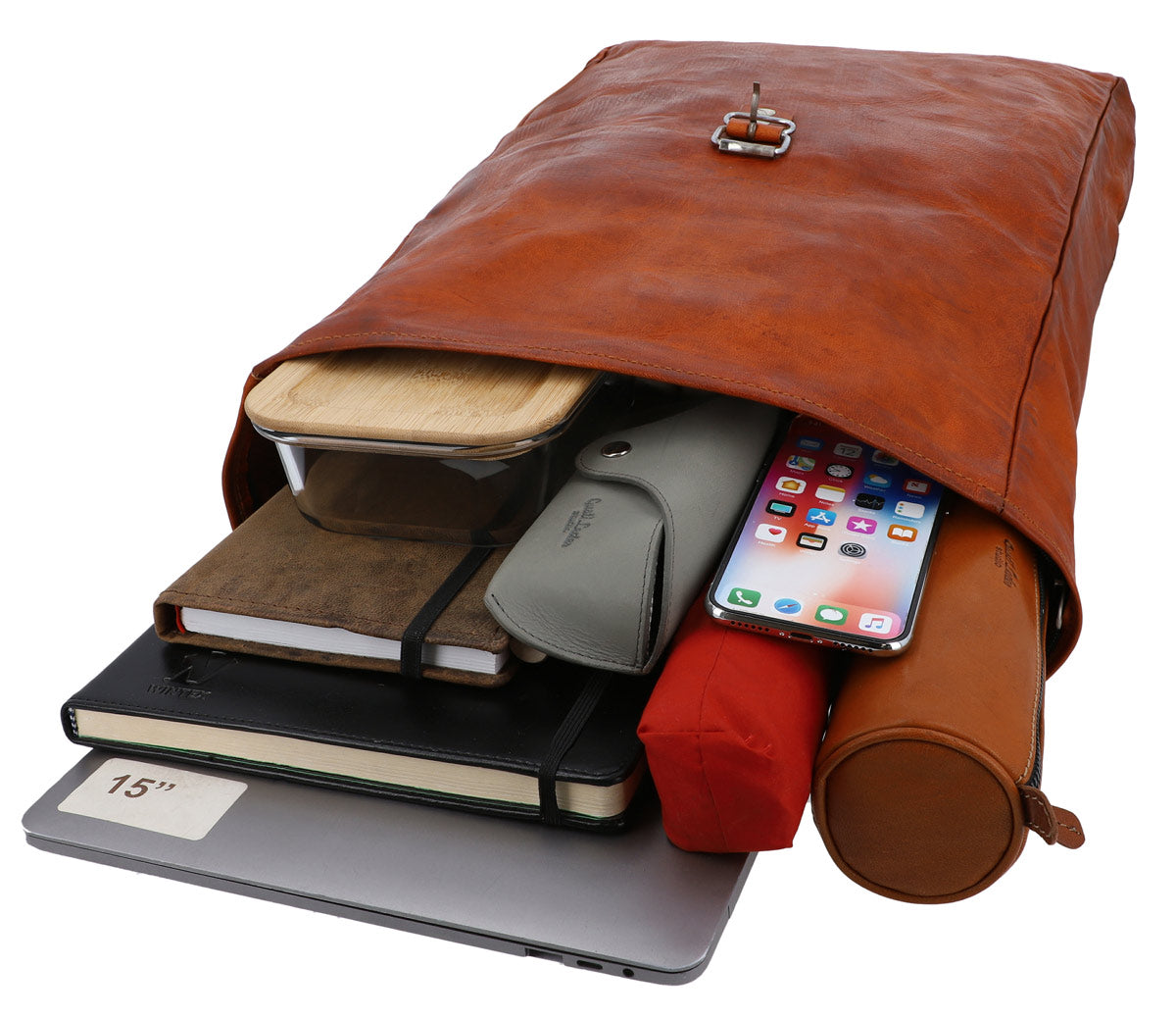 Do you need a nimble, compact backpack that impresses with casualness and retro optics? “Niklas” fits perfectly! The trendy roll-top made of vegetable-tanned goat leather is prepared for all small and big adventures in everyday life. This way, you have all your essentials together and can organize your day optimally. Whether university, work, or city stroll – “Niklas” is there and proves to be a charming eye-catcher and carefree companion.