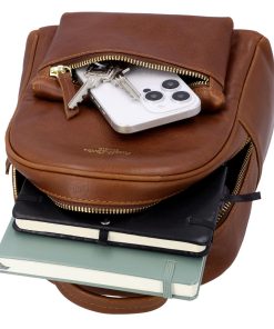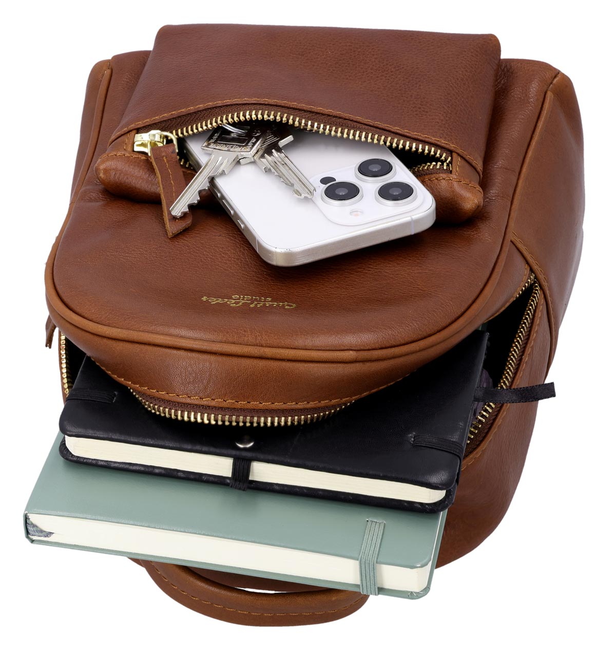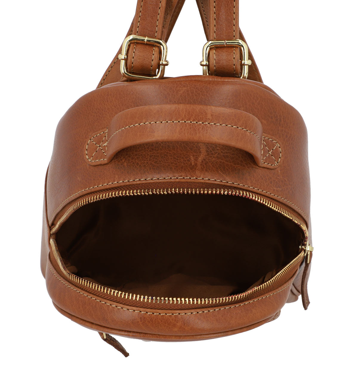“Wendy” is subtle and sophisticated, the perfect bag for your daily routine. The gold appliqué is expertly placed on the rich brown cowhide leather, so this backpack seamlessly transitions from daywear to evening wear. “Wendy’s” 5-litre capacity means you have more than enough space for your essentials: make-up, keys, diary, and purse. There’s an extra zipped pocket on the front of the bag for things you need easy access to. The perfect place for your phone or notepad. The comfortable adjustable straps add the final finishing touch to “Wendy”, so you can wear her all day long without any aches and pains. Our Gusti Leather nature products might have some slight variations in colour due to the natural manufacturing processes used to create them.