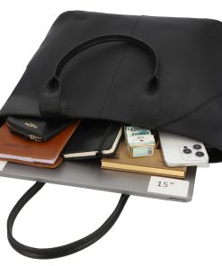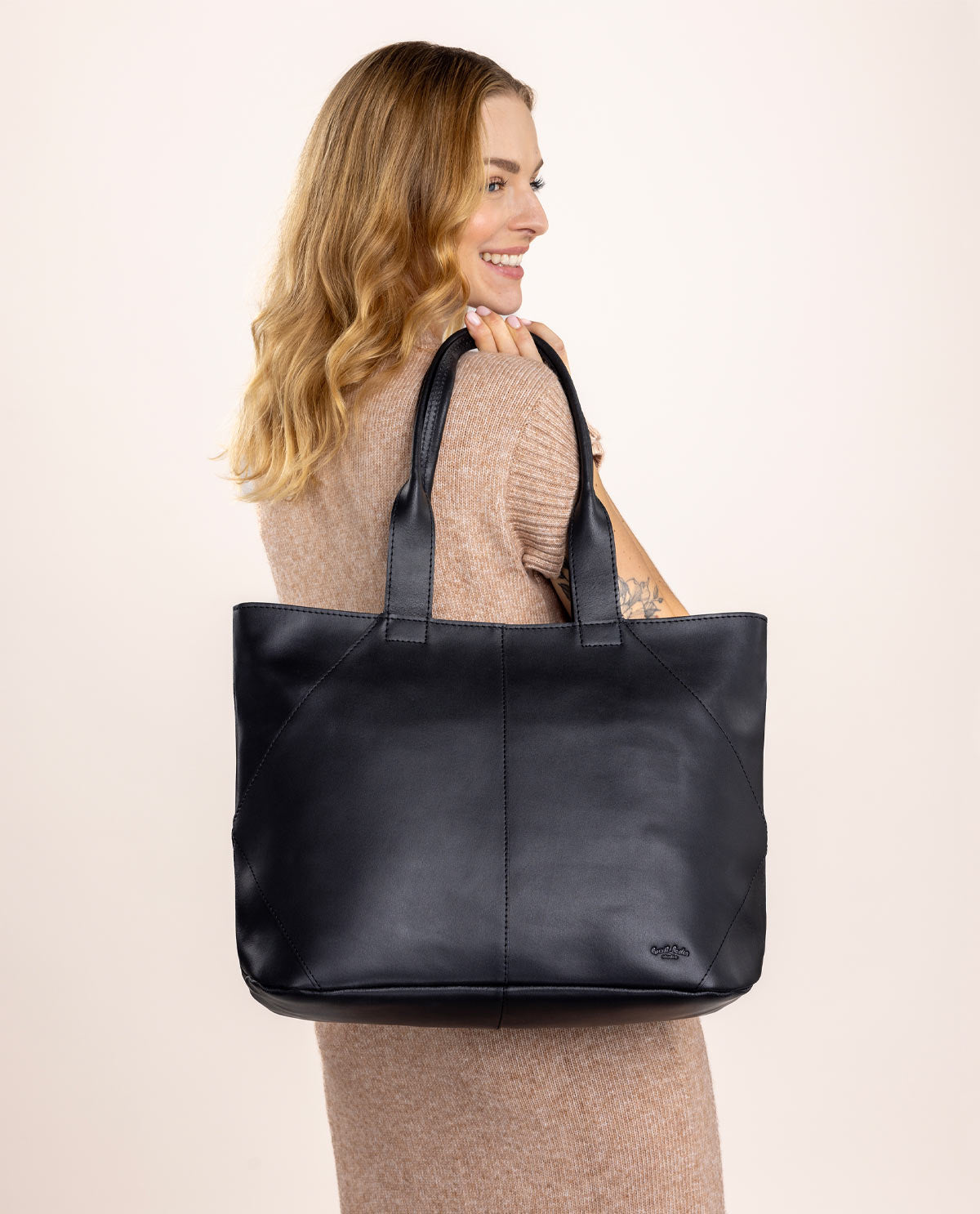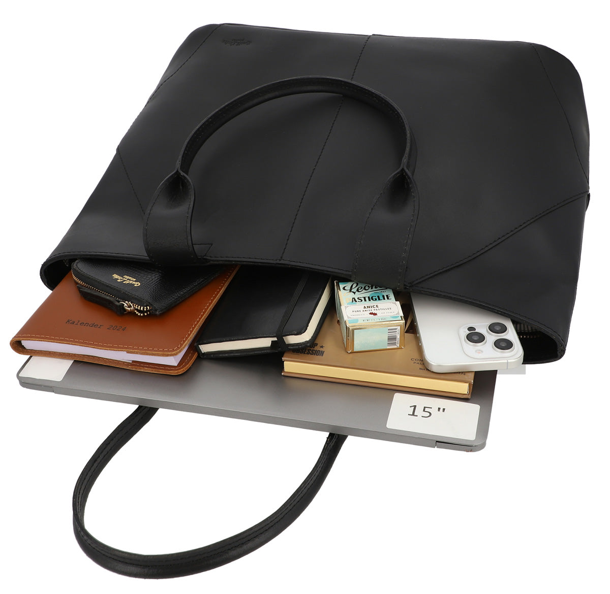 Spacious. Stunning. Versatile. That’s our “Cecilia”. This stunning high-quality shoulder bag is made of black cowhide leather and is perfect for shopping, strolling through the city, and at the office and university. She’ll wow you with her simple elegance, she’s discreet and sleek yet stylish and functional.