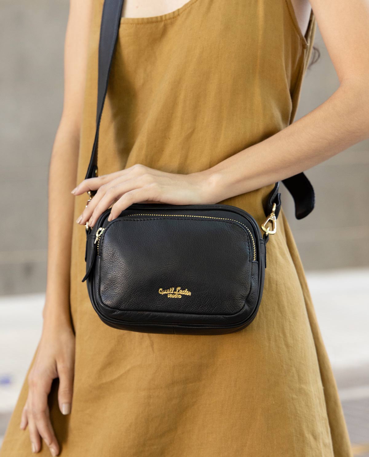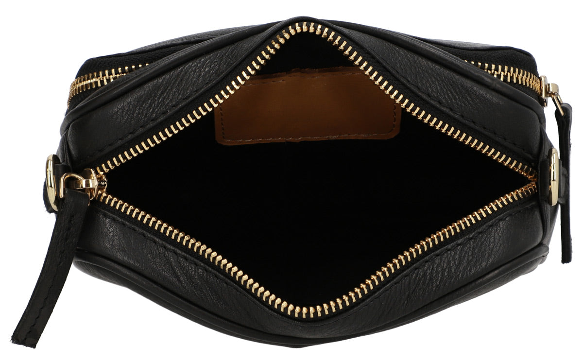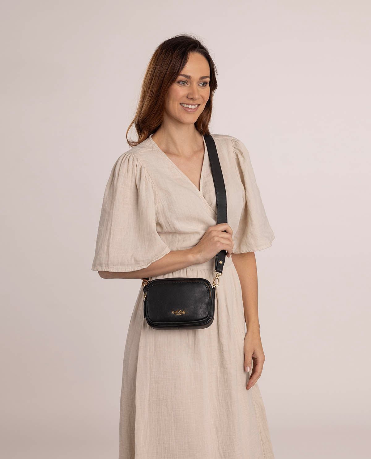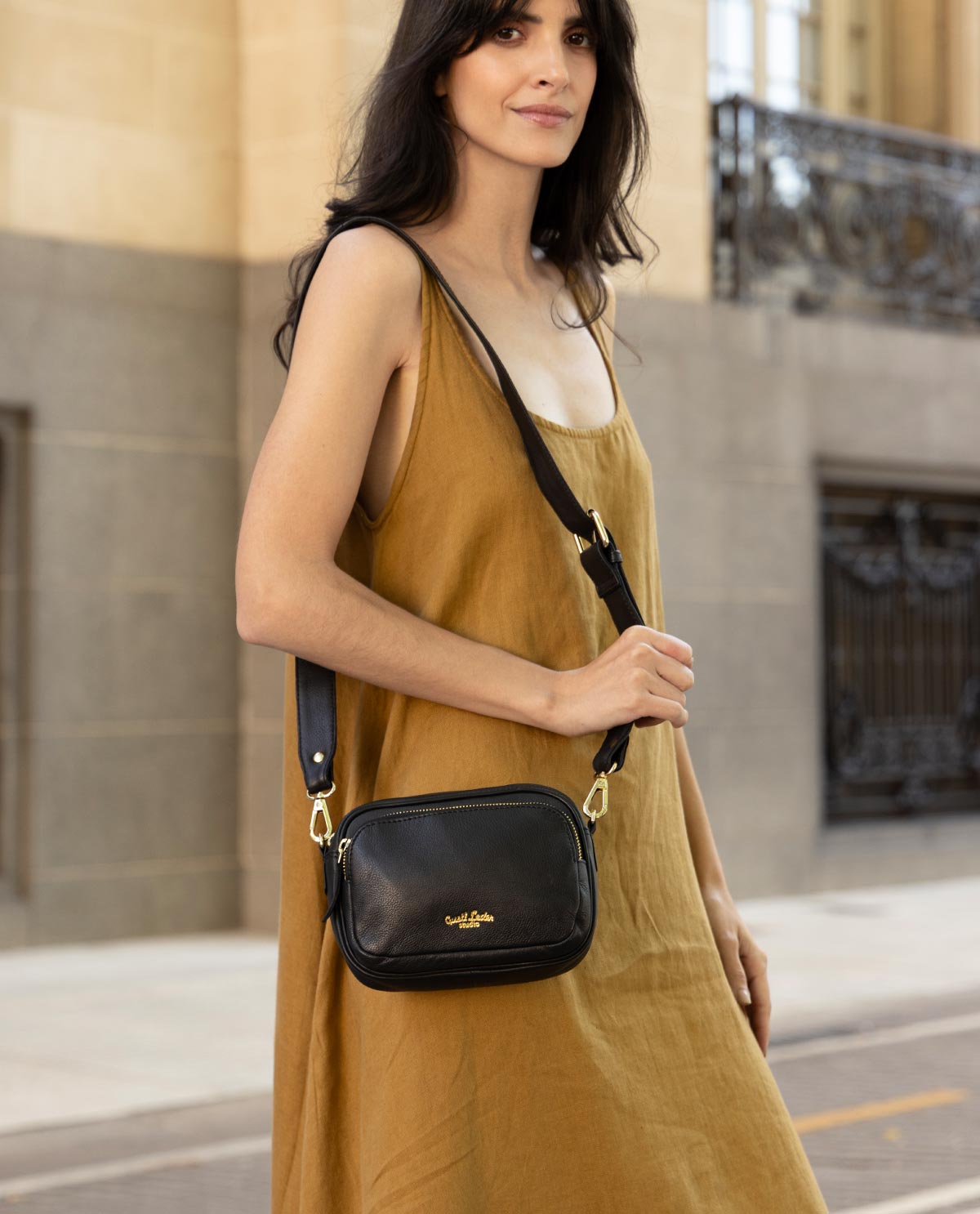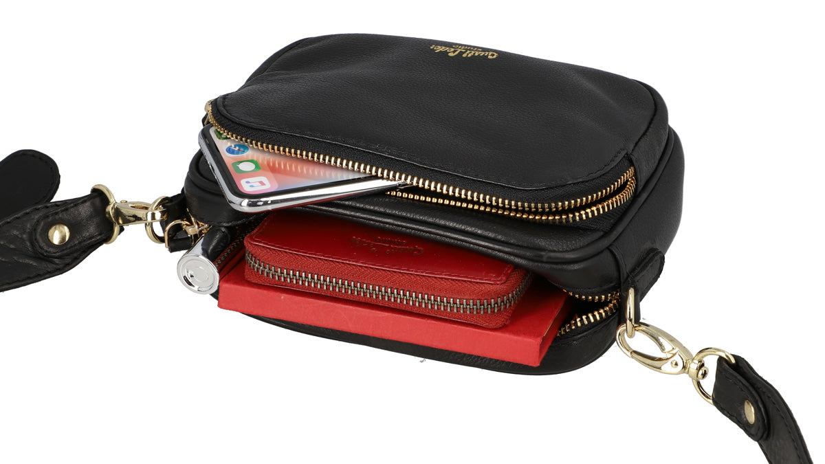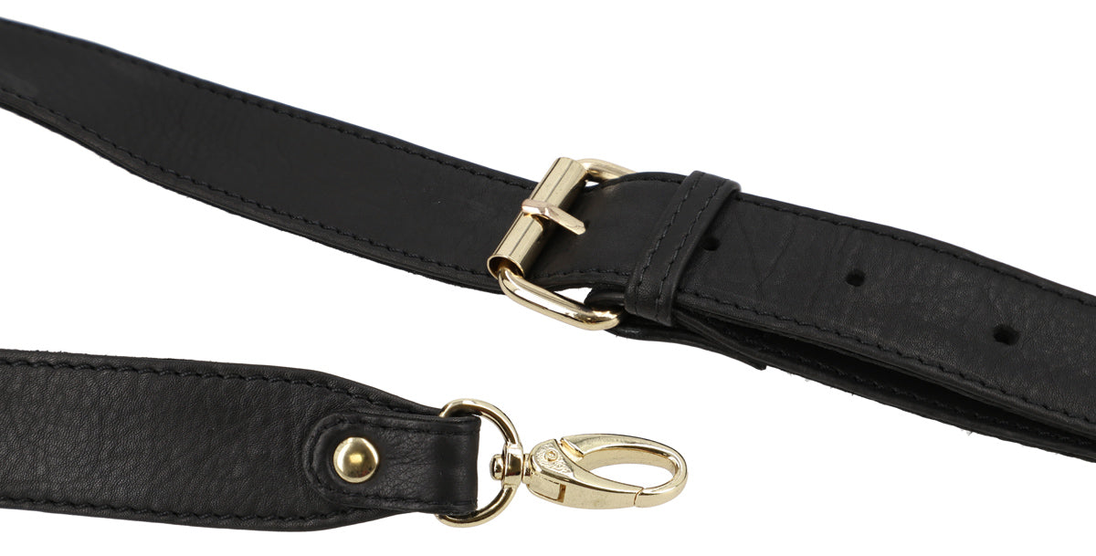 No matter if you’re at the club or strolling through the city, “Lulu” helps you keep your options open. Her compact size lets you move easily through crowds but still has enough space for your essentials. So, your wallet, keys, phone and make-up are kept safe inside. There’s an extra zipped pocket on the front of the bag for things you need easy access to. Keep your smaller items, like your phone or headphones, safe here. The gold detailing on the black cowhide leather finishes off “Lulu’s” chic design. There’s an extra adjustable strap with a gold carabiner fastening that you can easily attach to “Lulu”. Throw her over your shoulder and you’re ready to go.