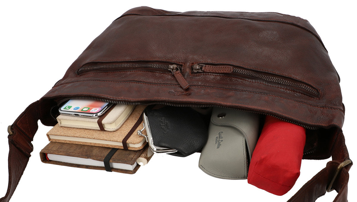 This high-quality tanned cowhide leather handbag is the perfect accessory at the bar or while browsing the shops. Her compact size lets you move easily through crowds but still has enough space for your essentials. Keep your purse, keys, and even your current read safe inside. There are two extra pockets on the front of the bag for your smaller items. Simply adjust the strap and hit the shops with this shoulder bag.