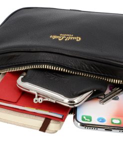 This high-quality leather bag has one spacious main compartment for your essentials. There’s plenty of space for your purse, make up, keys, phone and headphones. Your belongings are secured by a zip, so you won’t lose them when you’re on the go. Use the carabiners to attach the strap when you want to wear “Sofia” over your shoulder. Then remove it and use the two loops on the back of the bag to attach her to your belt. Enjoy the freedom and flexibility this unique bag provides.
