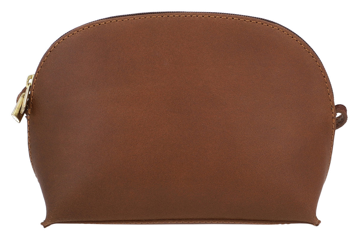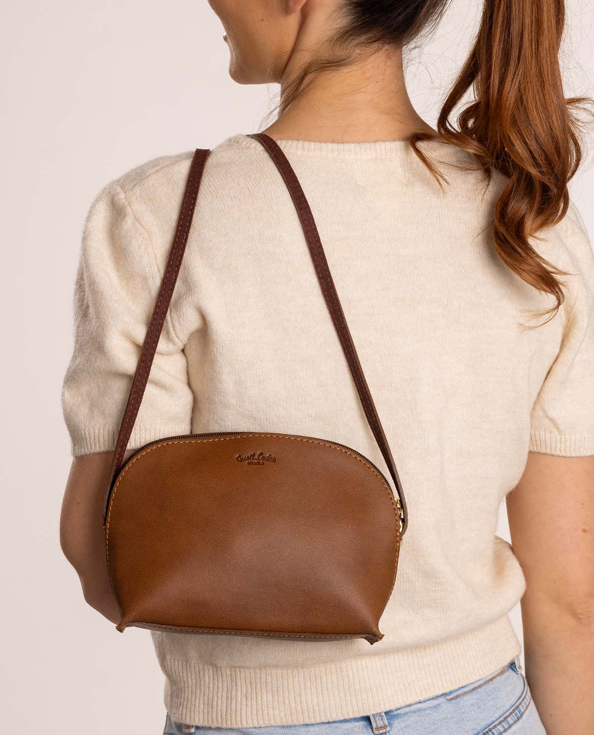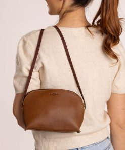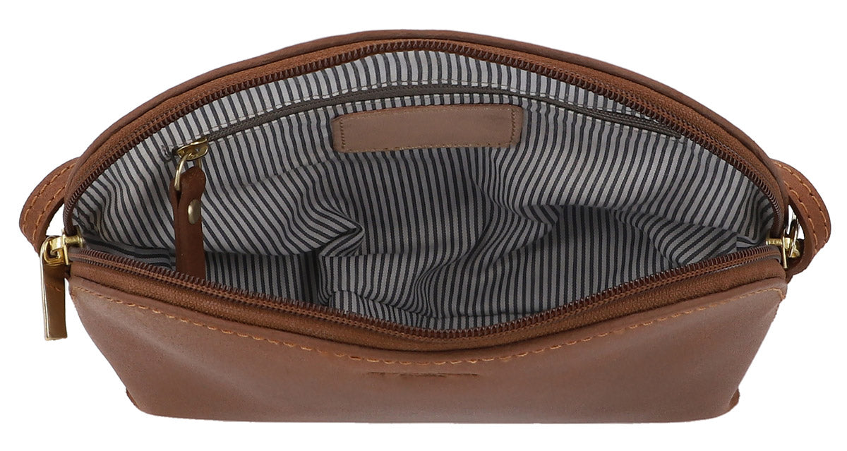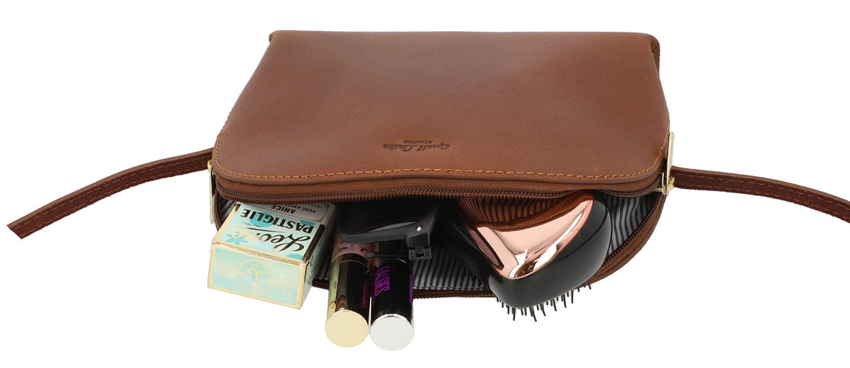 This stylish, sturdy brown cowhide leather handbag perfectly combines a flat-bottomed half-moon shape with an eye-catching gold two-way zipper, making “Tilda” easy to pair with any outfit and suitable for all occasions and events. “Tilda” even has an extra security feature – an internal zipped pocket that’s integrated into the bag’s striped lining for your keys, phone, or small purse, keeping your belongings safe from pickpockets.