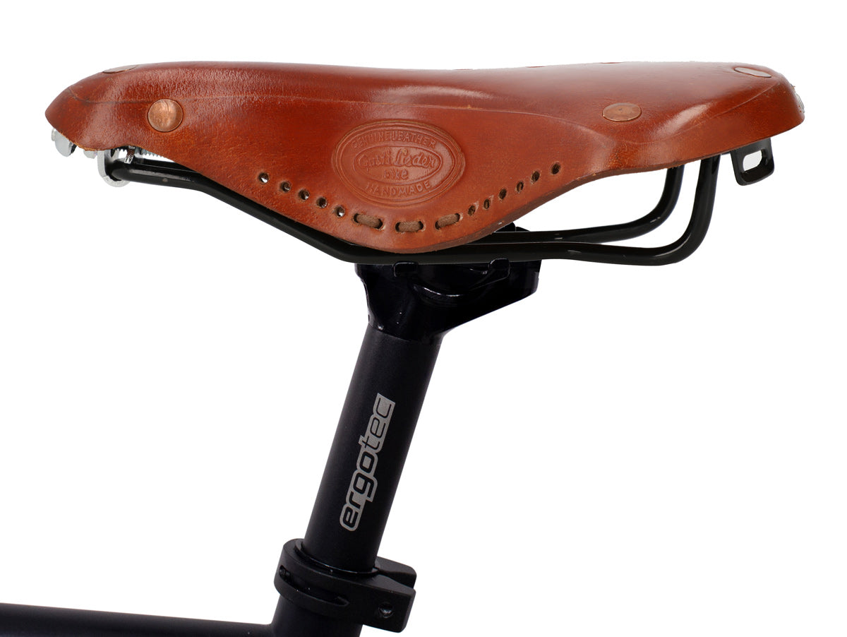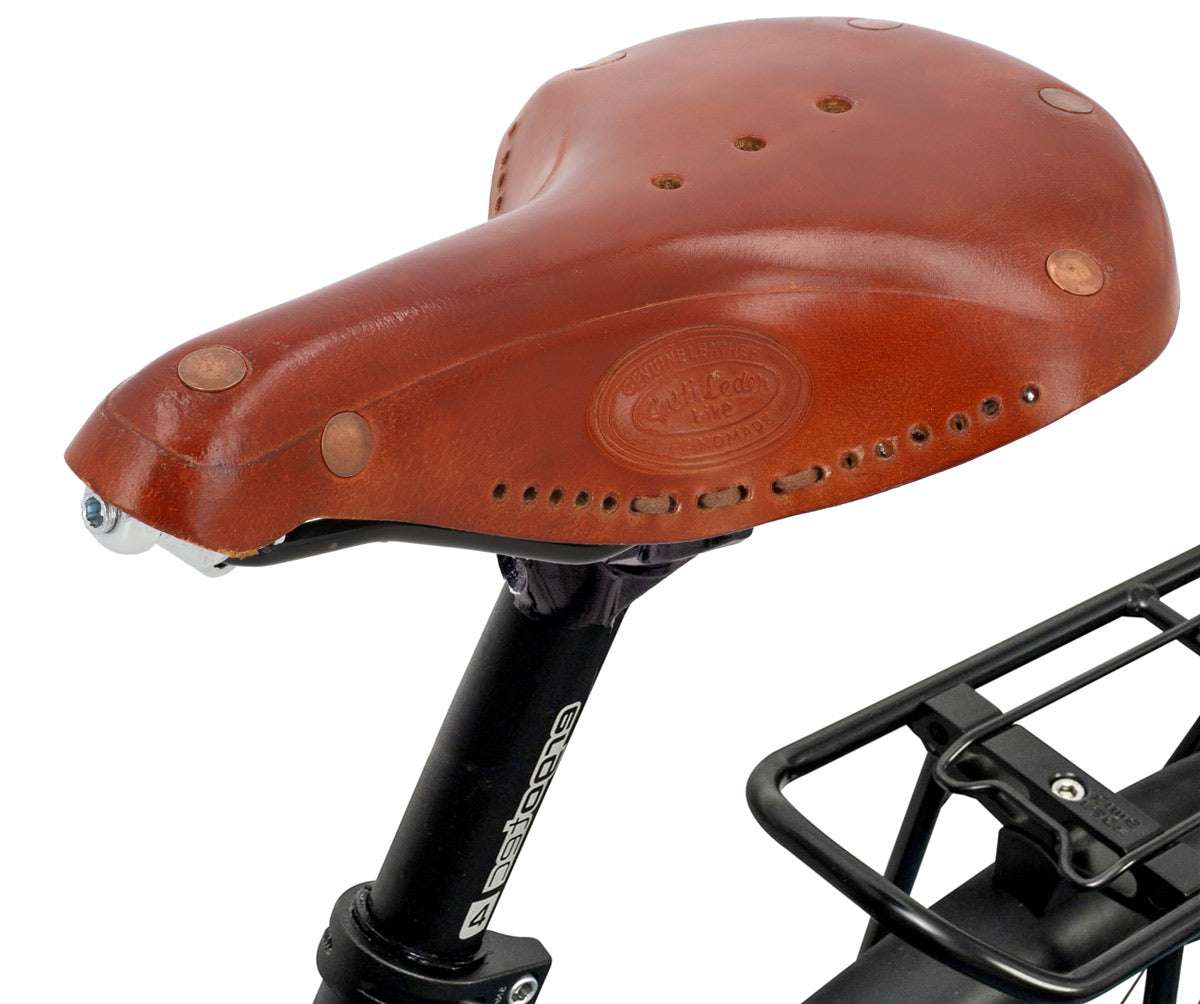 No matter if you’re on your electric bike or pushbike, our retro saddle “Eloi M.” is a true shapeshifter. Are you looking for an everyday bike saddle that always looks good? A multifunctional saddle that’ll turn others green with envy? This saddle comes in a vintage design and is made of high-quality processed buffalo leather, which doesn’t just make your bike look beautiful but means that you’ll arrive at your destination looking stylish and unique. “Eloi M.” has coated riveting around the edges and you can easily attach your saddle bag using the two saddle rails on the back. You’ll have plenty of space, freedom and flexibility on long and short bike rides.