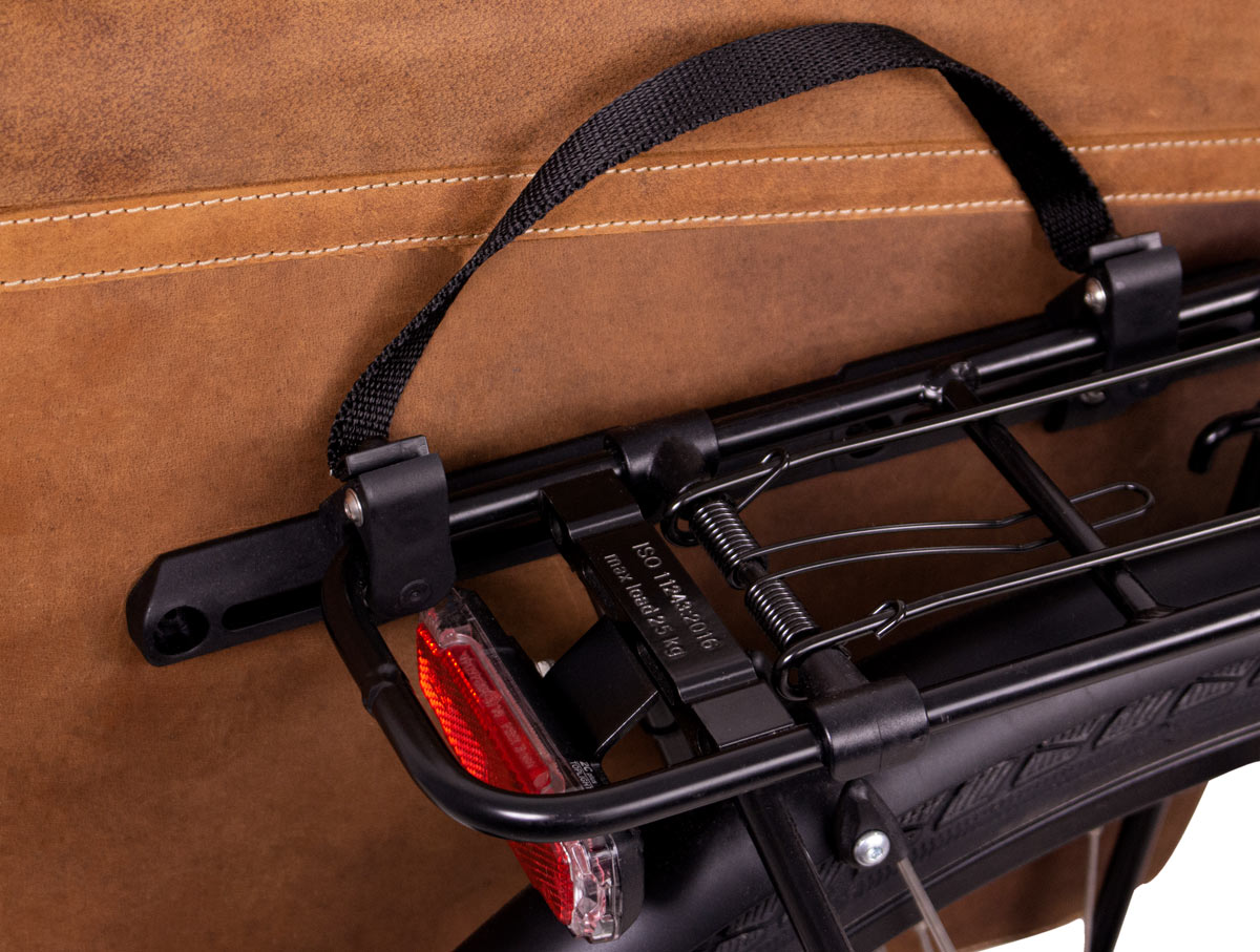 Thanks to the water-resistant polycotton lining, your belongings are perfectly protected even during sudden rain showers, allowing you to fully focus on your adventure. Additionally, “Marc” is equipped with two plastic mounting rails with clips that make it easy to attach to the luggage rack, ensuring your bag stays safe and stable on your bike.