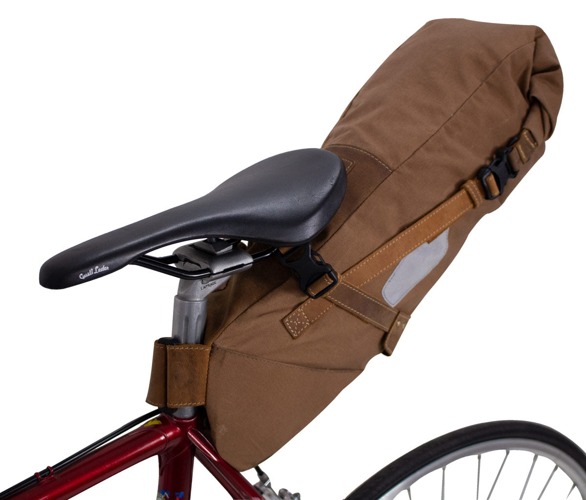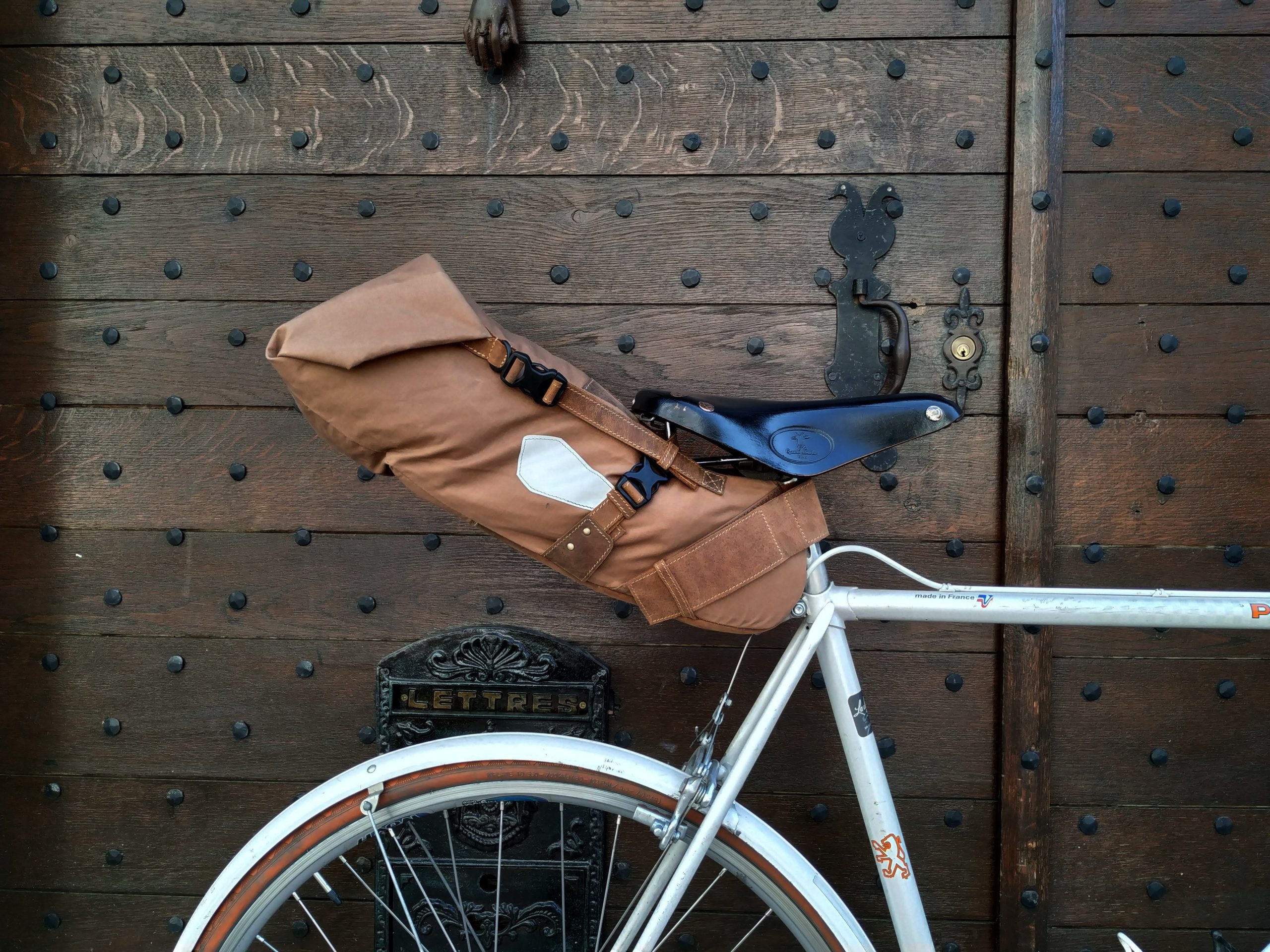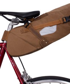 Our saddle bag saddlebag “Romain M.” provides you with lots of space so you can have everything you need on every ride. Its extra large main compartment provides plenty of space for your lock, tools, snacks, water bottle and more. The combination of canvas and high-quality buffalo leather ensures the bag is stable, while the water-resistant lining keep your gear dry – perfect for all weather conditions.