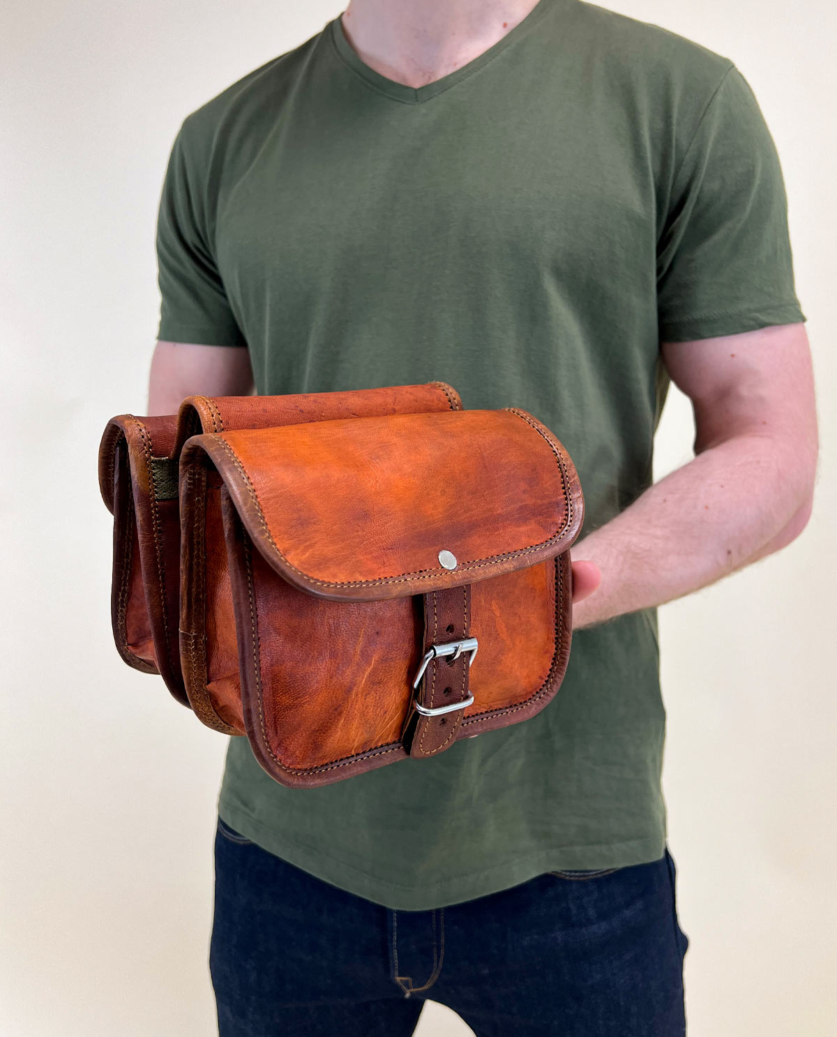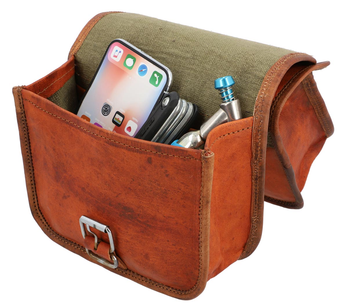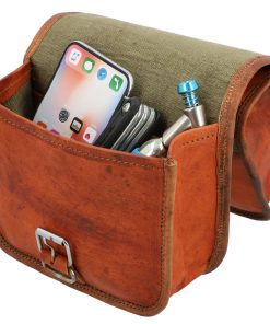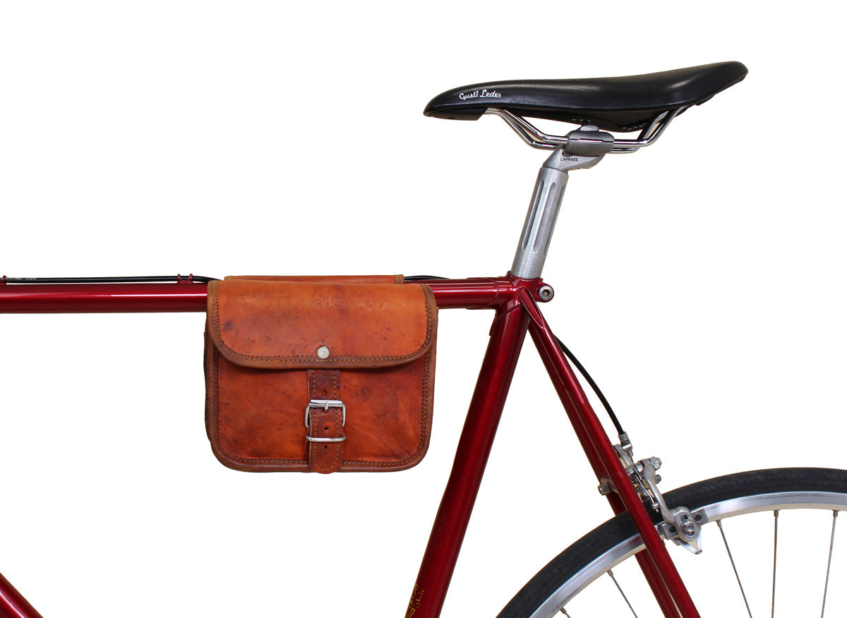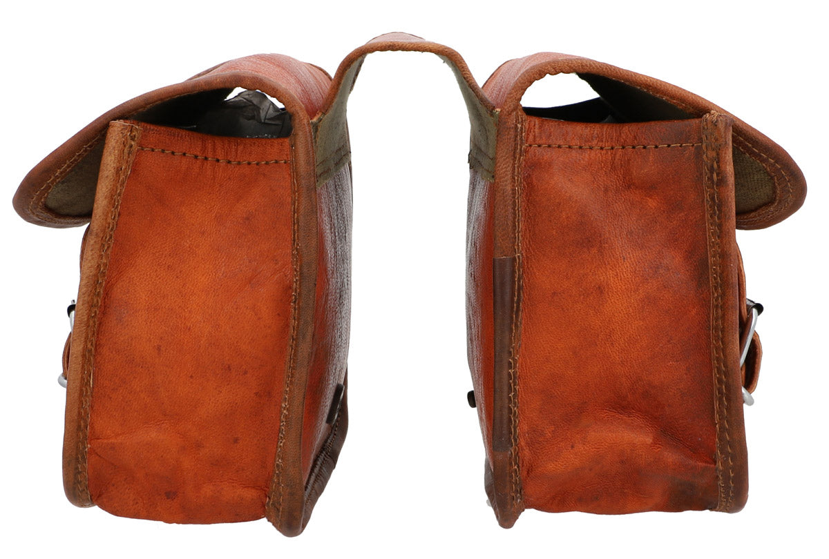 Double trouble! Our “Sabine S.” will enchant you with its two petite bags for the bicycle frame. This bike accessory is made of naturally tanned goatskin and is part of our Gusti Leder nature brand. The bag can easily be placed on your bike’s crossbar and offers you charming additional storage space for your purse, keys or your smartphone. The bags are closed using buckles, which add to the unique vintage look. Retrofit your bike with this lovely accessory.